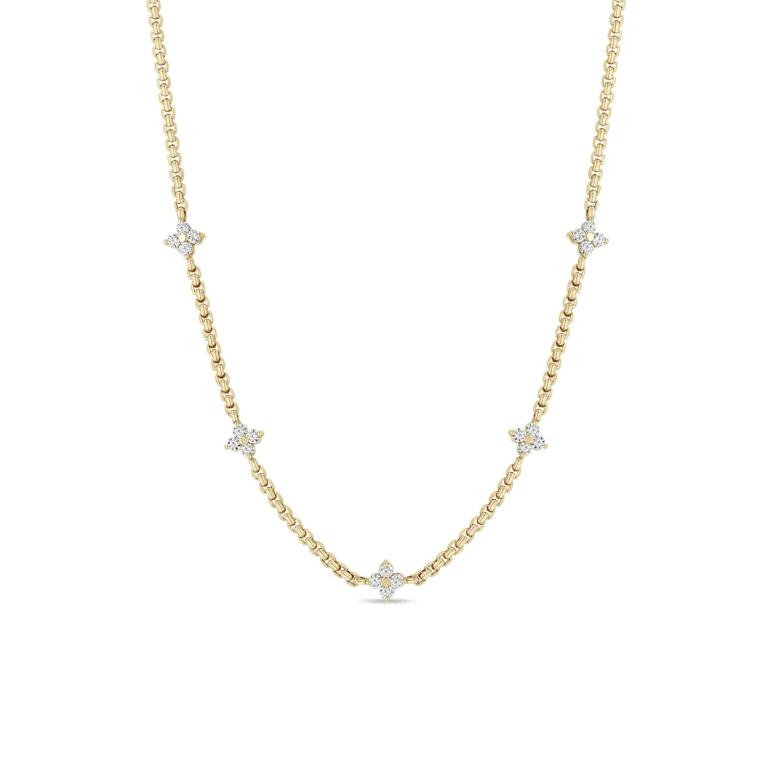 14k gold small box chain necklace with five stations of small prong set round diamond quad clusters