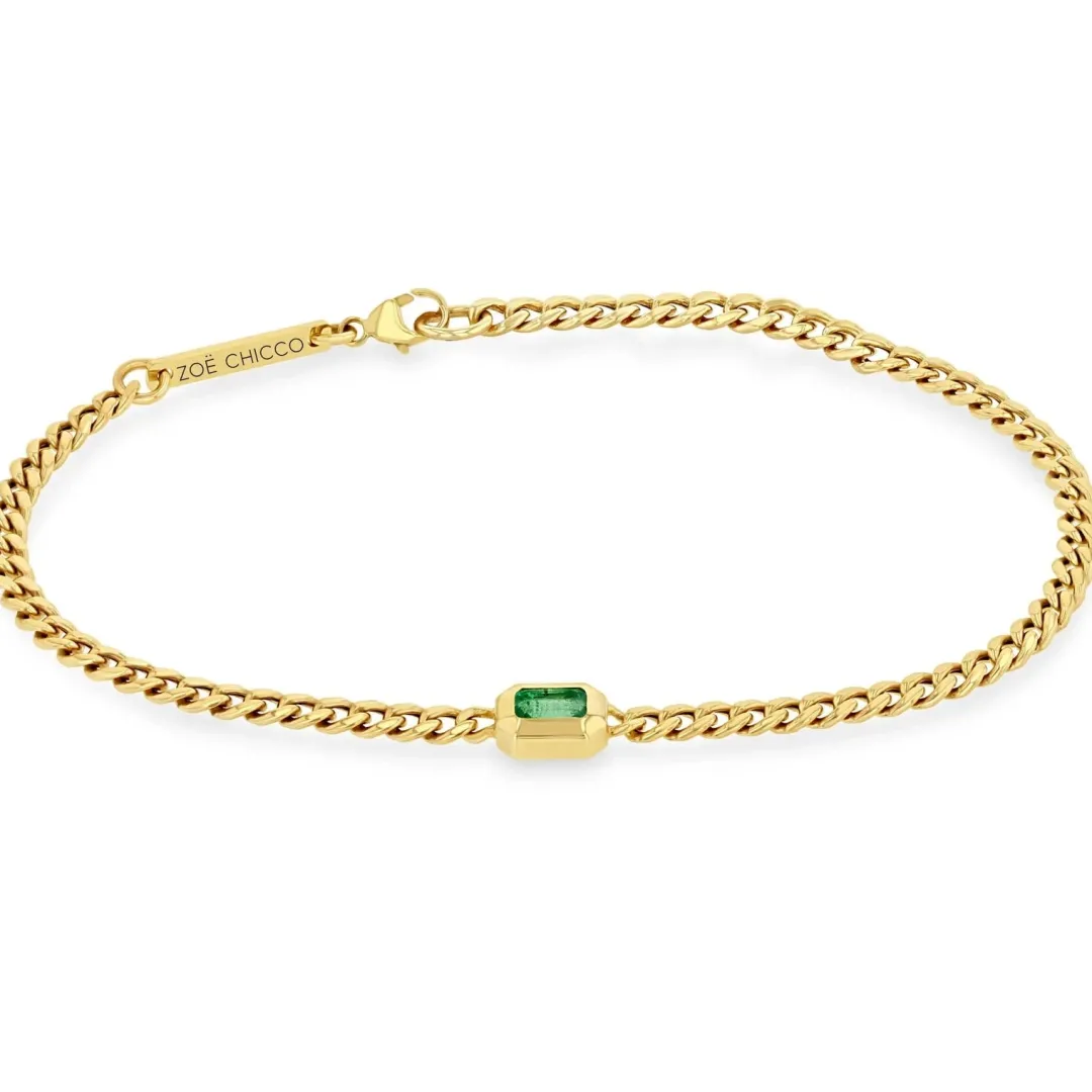14k gold small hollow curb chain bracelet with a bezel set emerald cut emerald