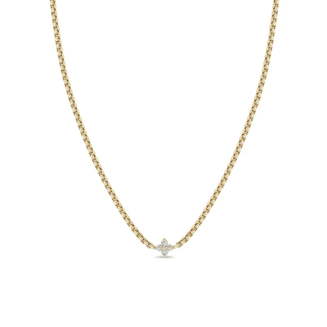 14k gold small box chain necklace with a small quad cluster of prong set round diamonds