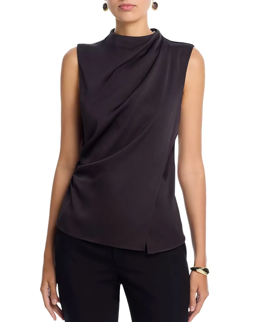 Gentle ruching at the right side adds a touch of contemporary allure to a sleeveless top cut from silky-smooth fabric.
