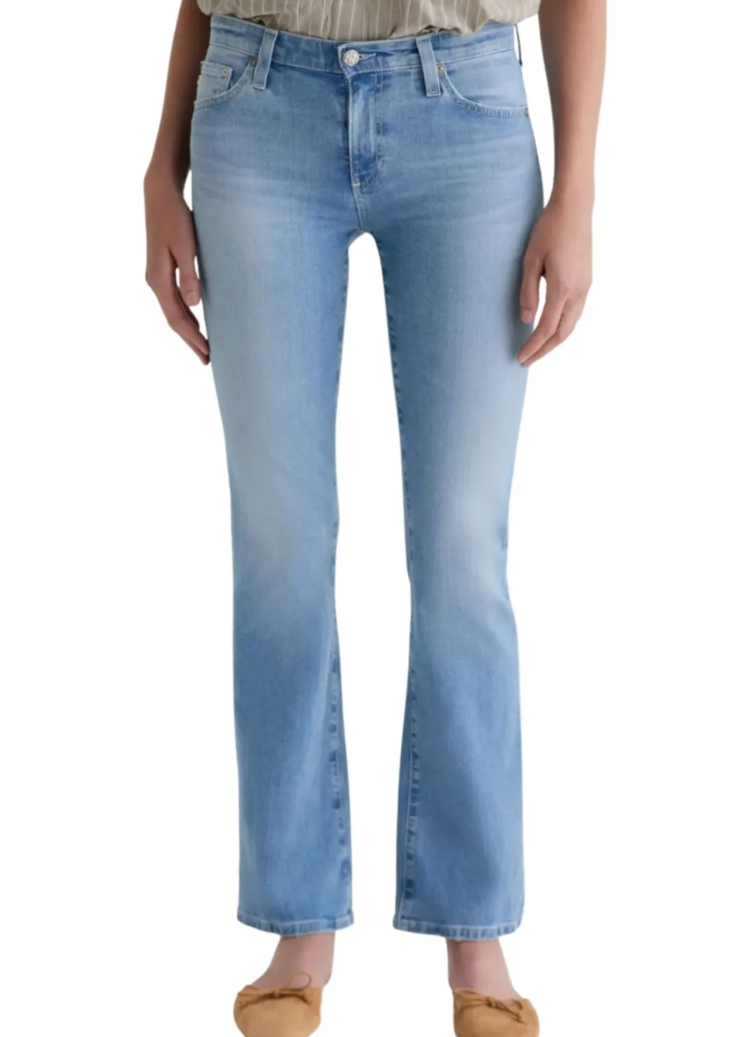 A low-rise waist brings throwback style to polished, full-length bootcut jeans made from premium stretch denim.