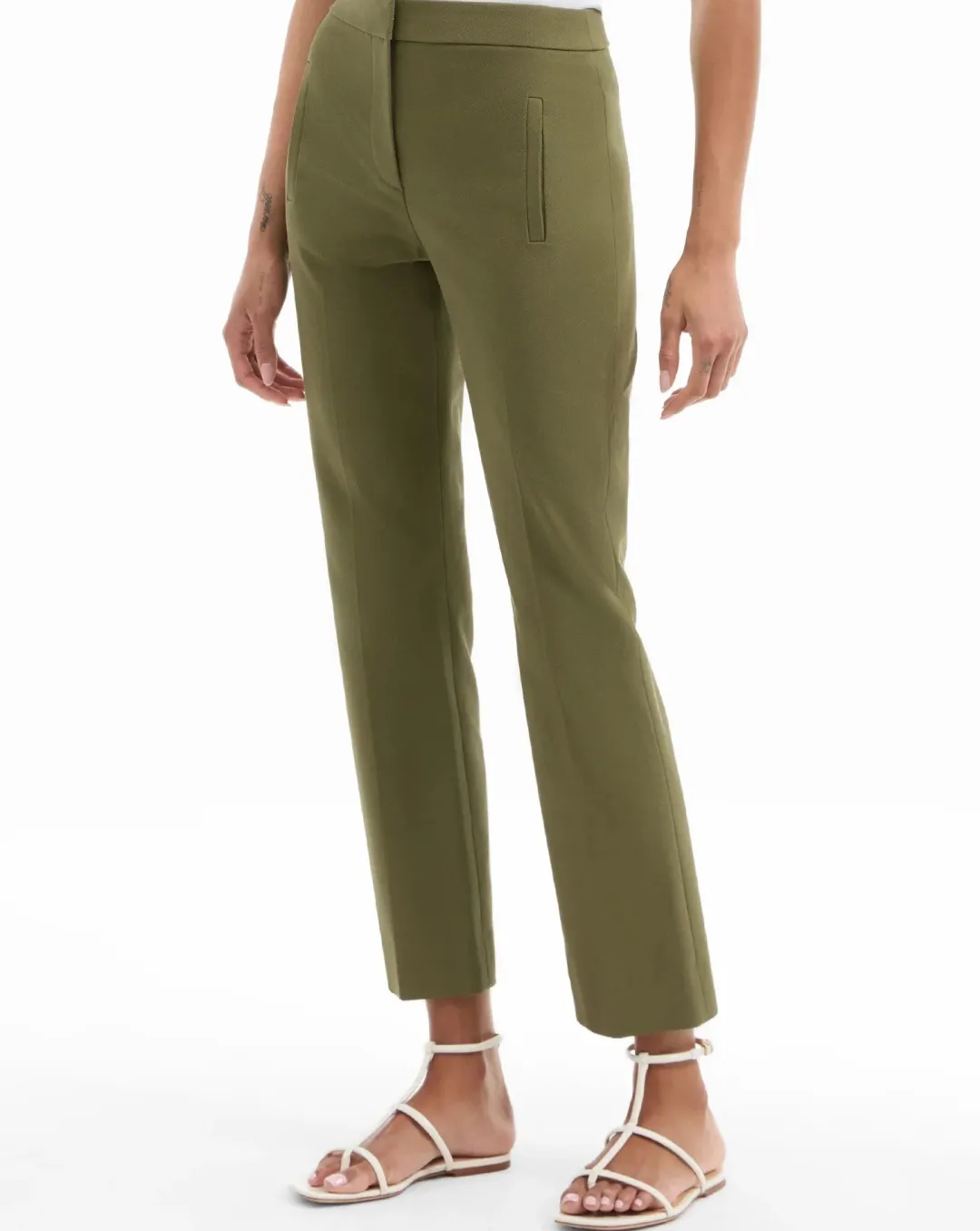 A VB favorite, now updated in cool army green. The Arte pant is a cropped, high-waisted pant with a slim fit and slightly flared hem, finished with flat welt pockets and a hidden hook-and-bar closure for a sleek, tailored look. Crafted from a soft and breathable stretch-cotton blend, it’s the perfect pant for summer—pair it with the coordinating Avalina vest for a sleek tailored set.