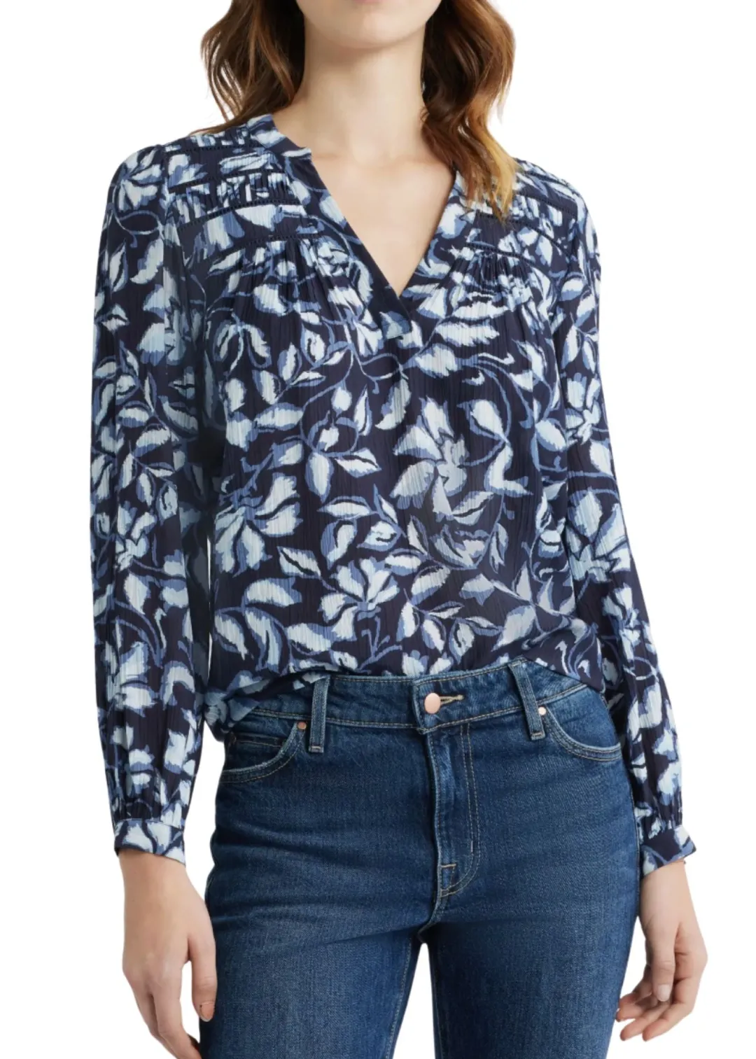 Crinkly fabric enhances the easygoing look and feel of a breezy split-neck top rendered in a print of flowering vines.