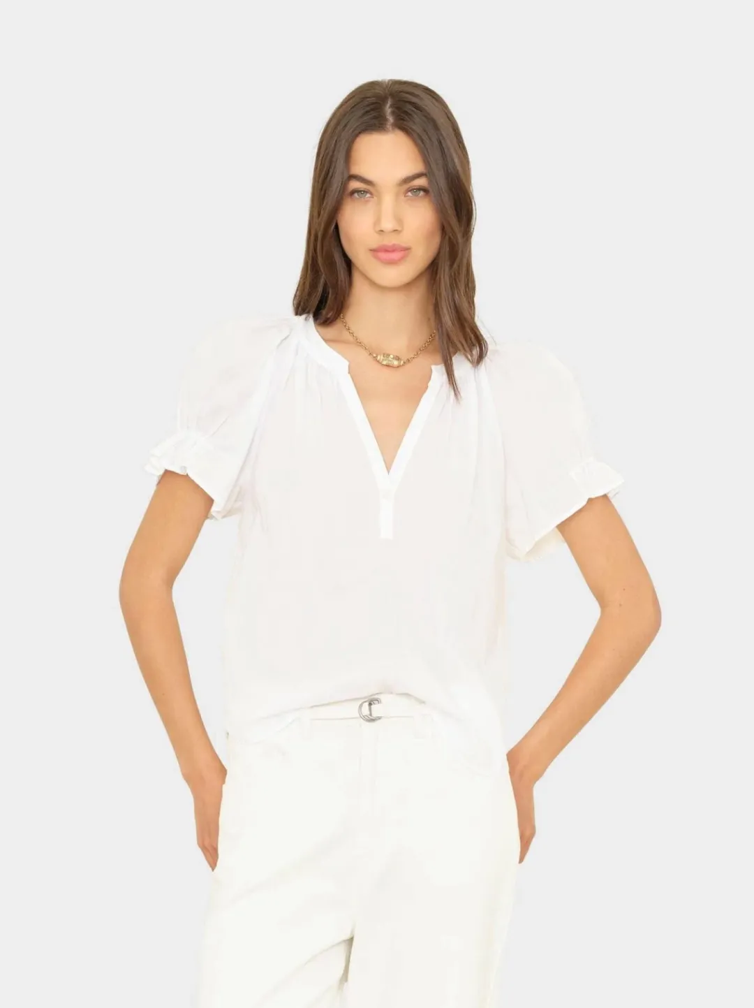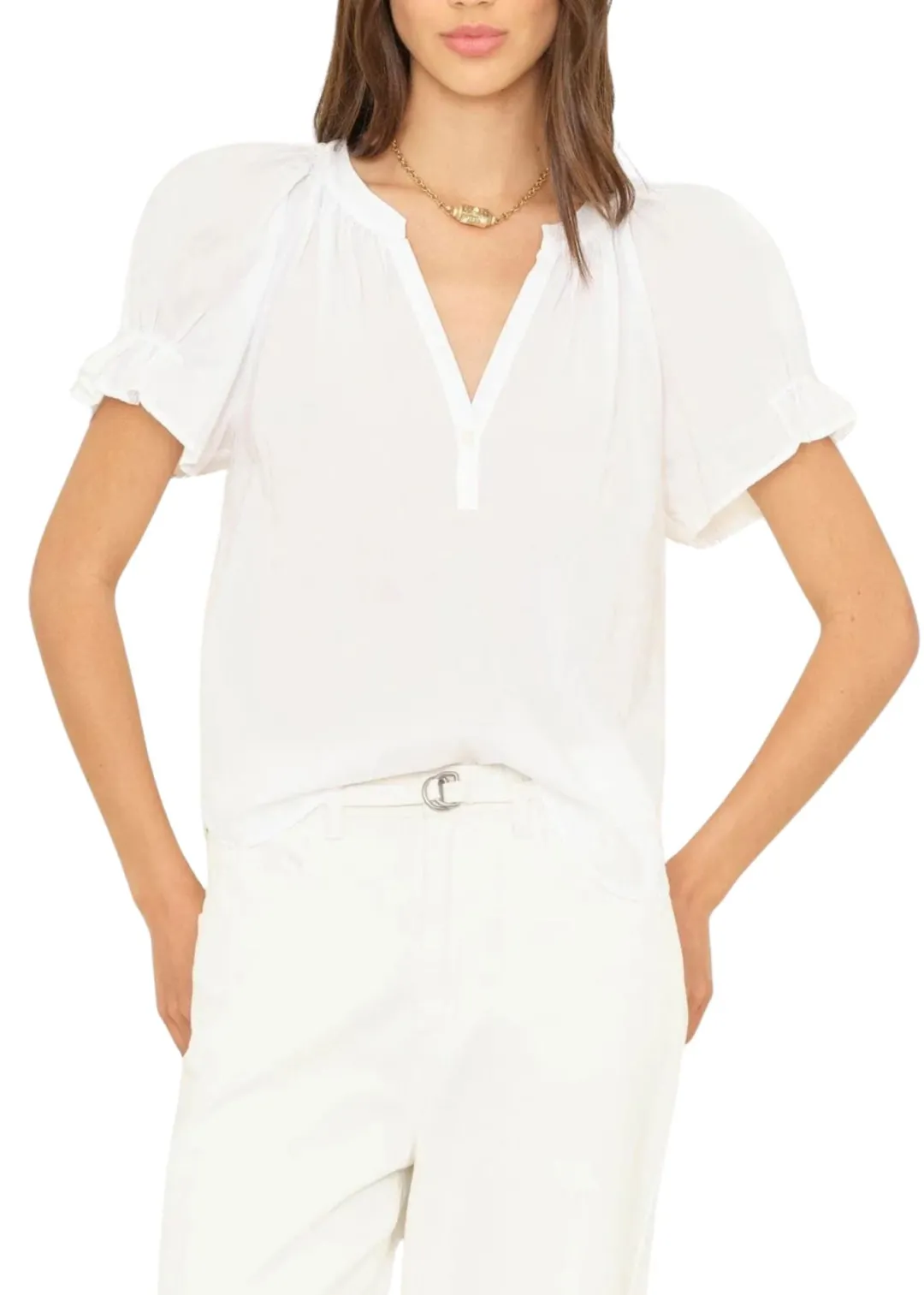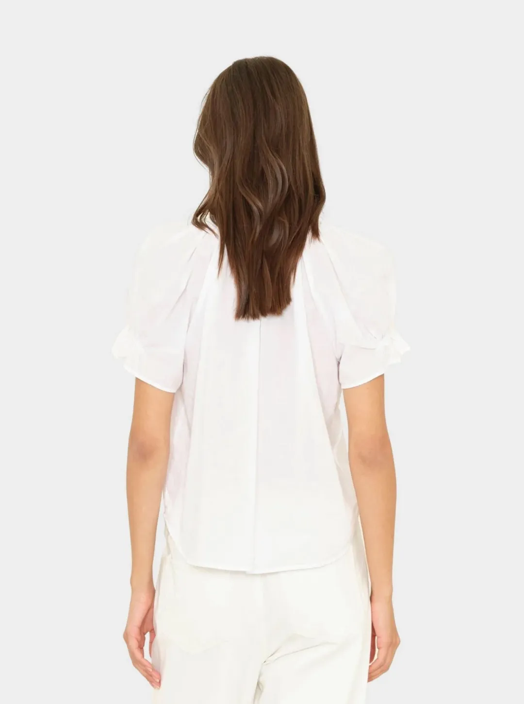 Pretty Please. Astryde is made in our classic lightweight woven cotton poplin for a lived-in look and feel. Astryde is a femme V-neck blouse that features a singular button-closure, short puff raglan sleeves with elastic ruffles, and shirred details throughout.