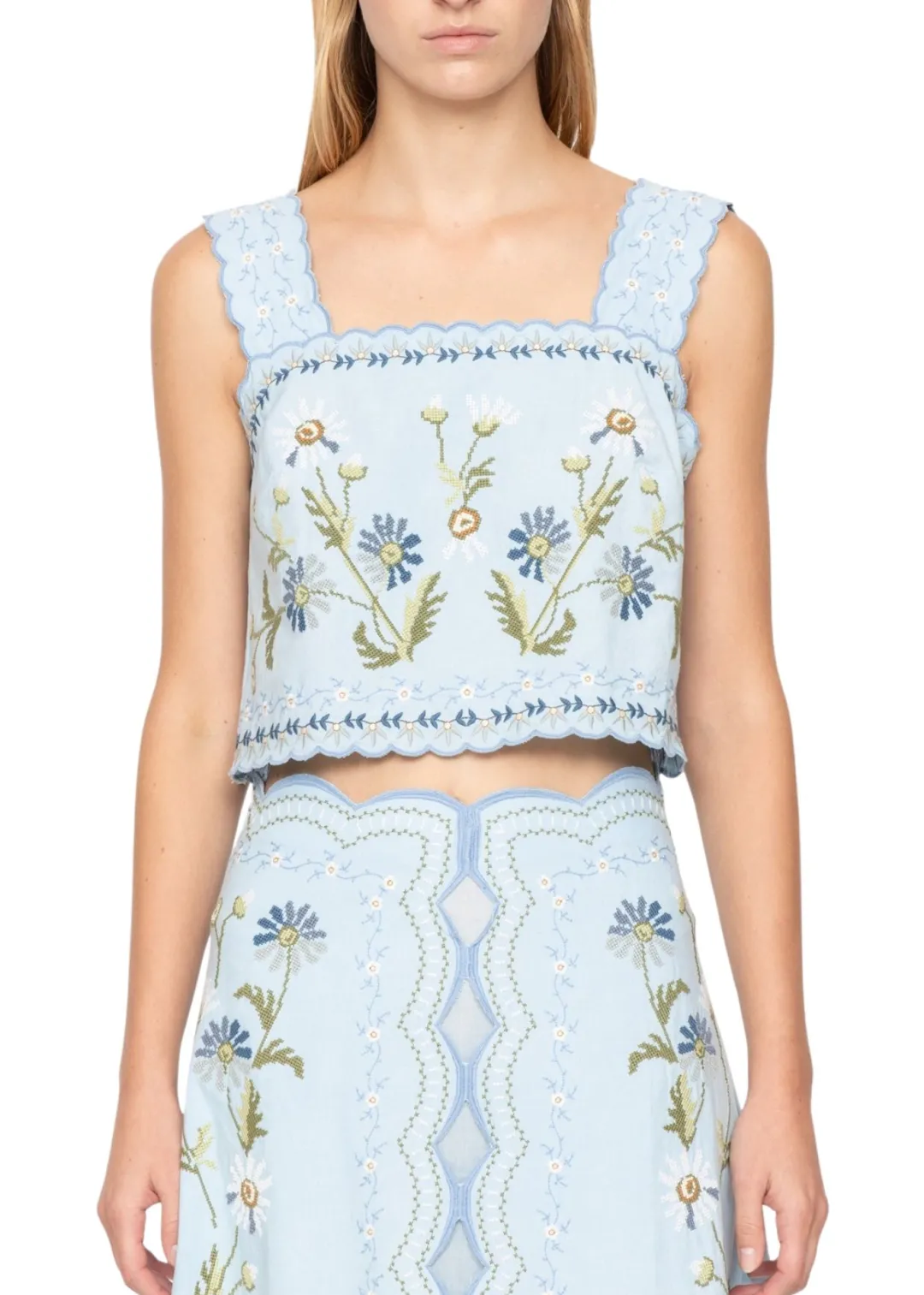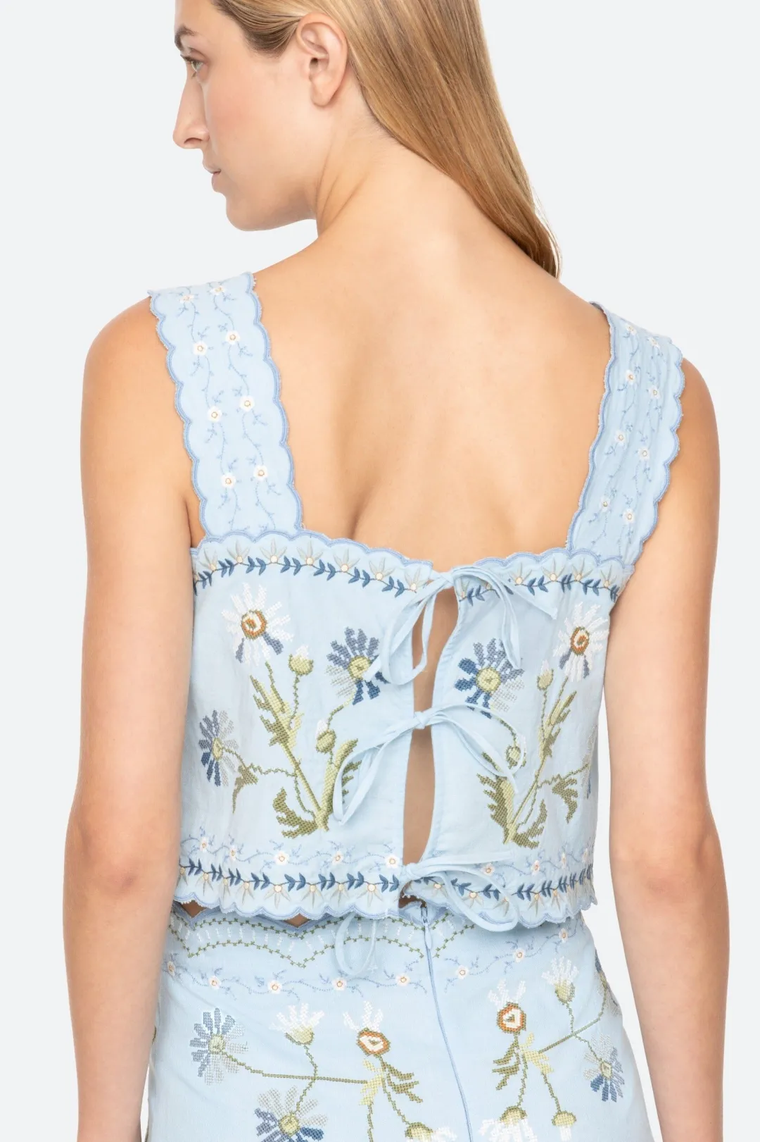 The Audra embroidered tank top features a cropped silhouette with delicate scalloped edges and tie fastening at the back. Adorned with detailed floral embroidery throughout, it offers a feminine and charming finish.