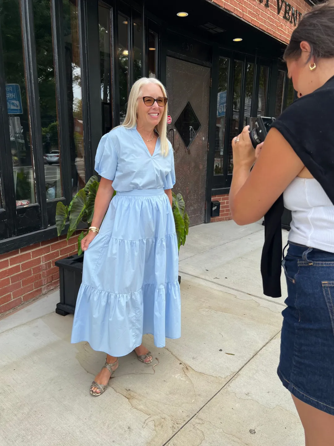 The Audrey Top proves that polish and ease can coexist. Designed in non-toxic, no-fuss cotton, this sky-blue blouse is cut to breathe, move, and keep its shape from morning through evening. A softened V-neckline trimmed in ruffle detail and subtly structured puff sleeves give it presence without effort — the kind of detail that dresses up denim just as easily as it completes its matching skirt. Pack it, layer it, live in it: this is timeless style without the maintenance.