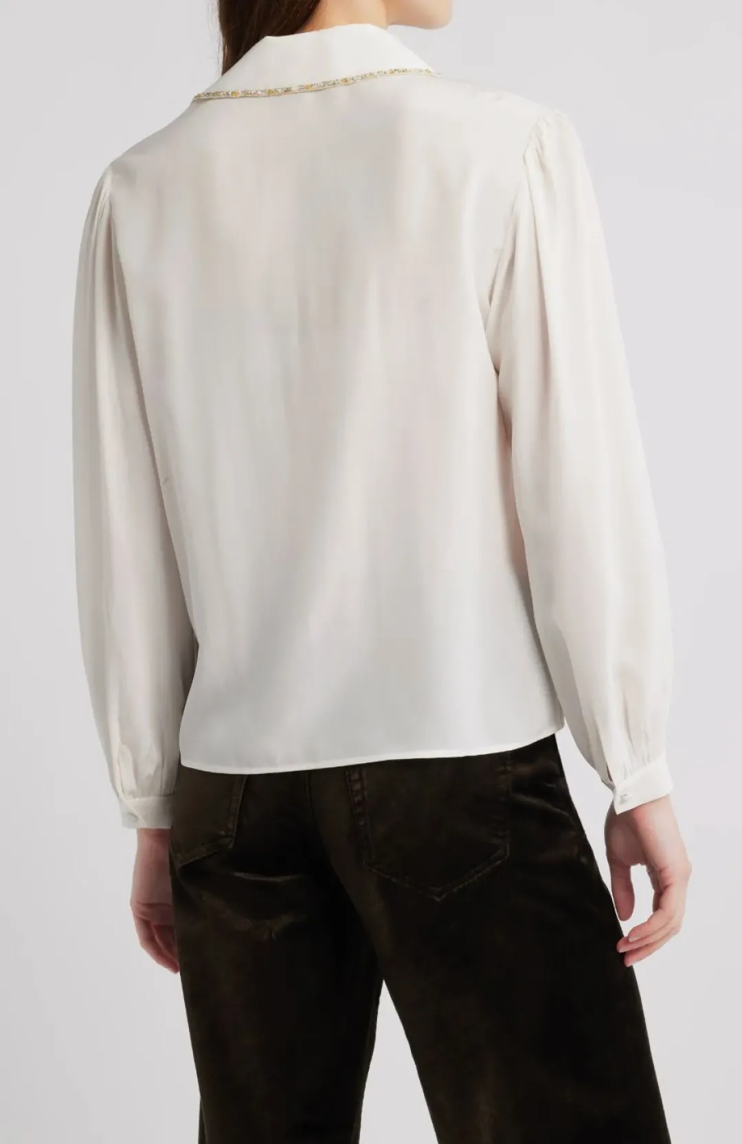 Delicate beading traces the edges of a point collar to refine this goes-with-anything shirt made from supple silk.