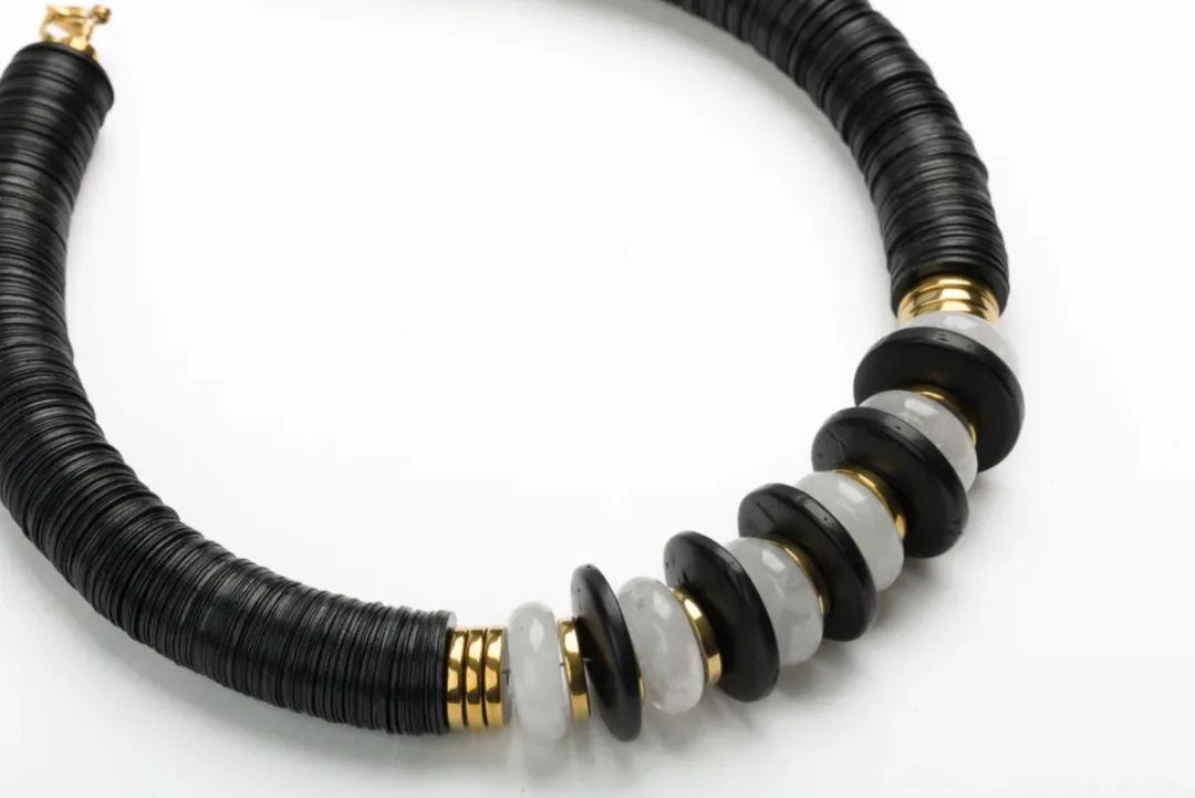 Embrace the bold and vibrant spirit of India with Hijas de Puka’s JAIPUR collection. Inspired by India’s rich colors and bold styles, this collection features necklaces adorned with colorful Vinyl African beads, sparkling pave cubic zirconia spacers, and sleek hematite rondels. Each piece is a harmonious blend of lively Indian hues and elegant design, perfect for adding a touch of glamour and cultural flair to any outfit.