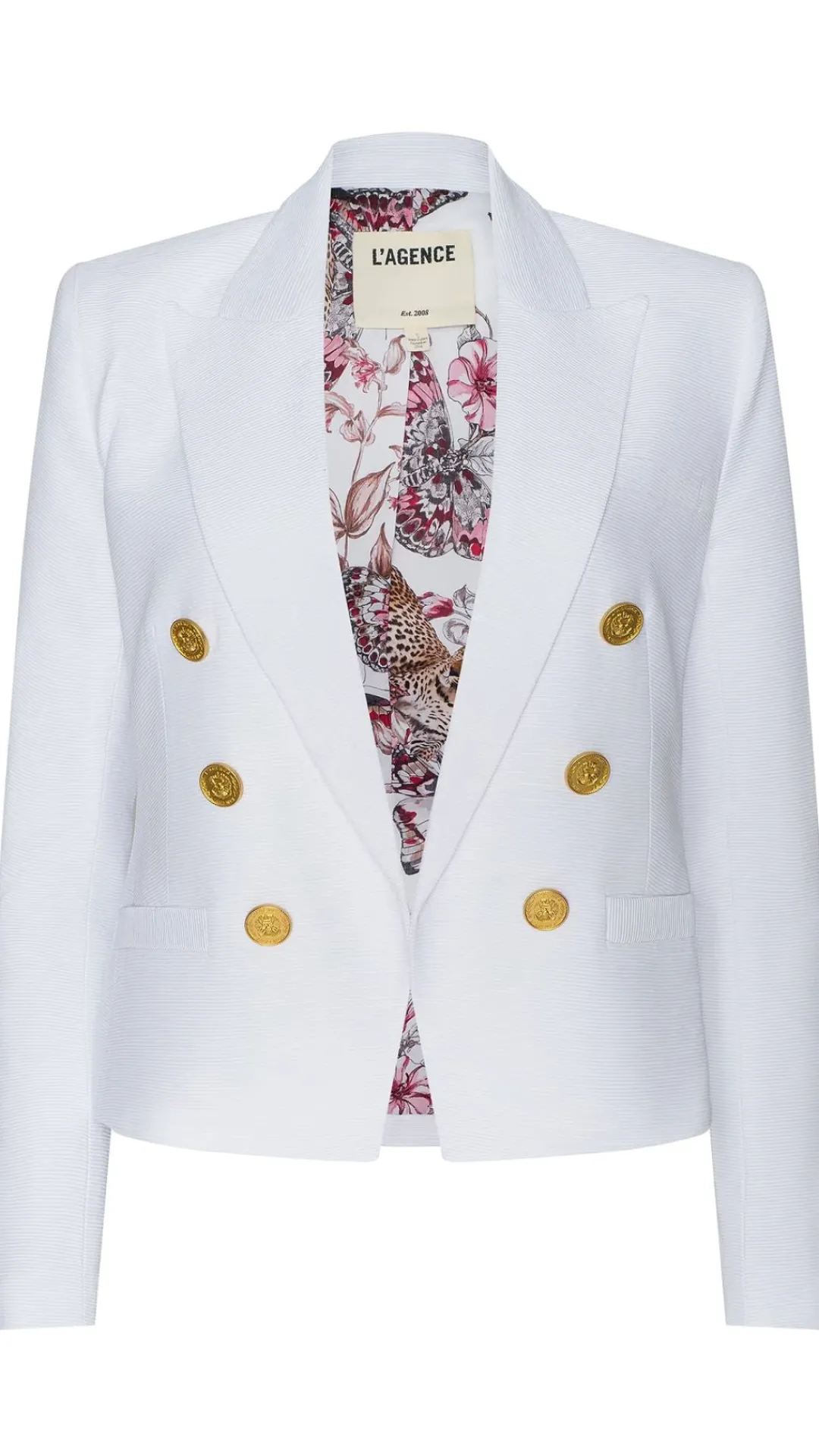 Our bestselling open-front Brooke features a flattering, tapered fit. Crafted from a lightweight ribbed ottoman fabric featuring a cool, slick hand and subtle luster, this sharp, double-breasted blazer is now back in white.