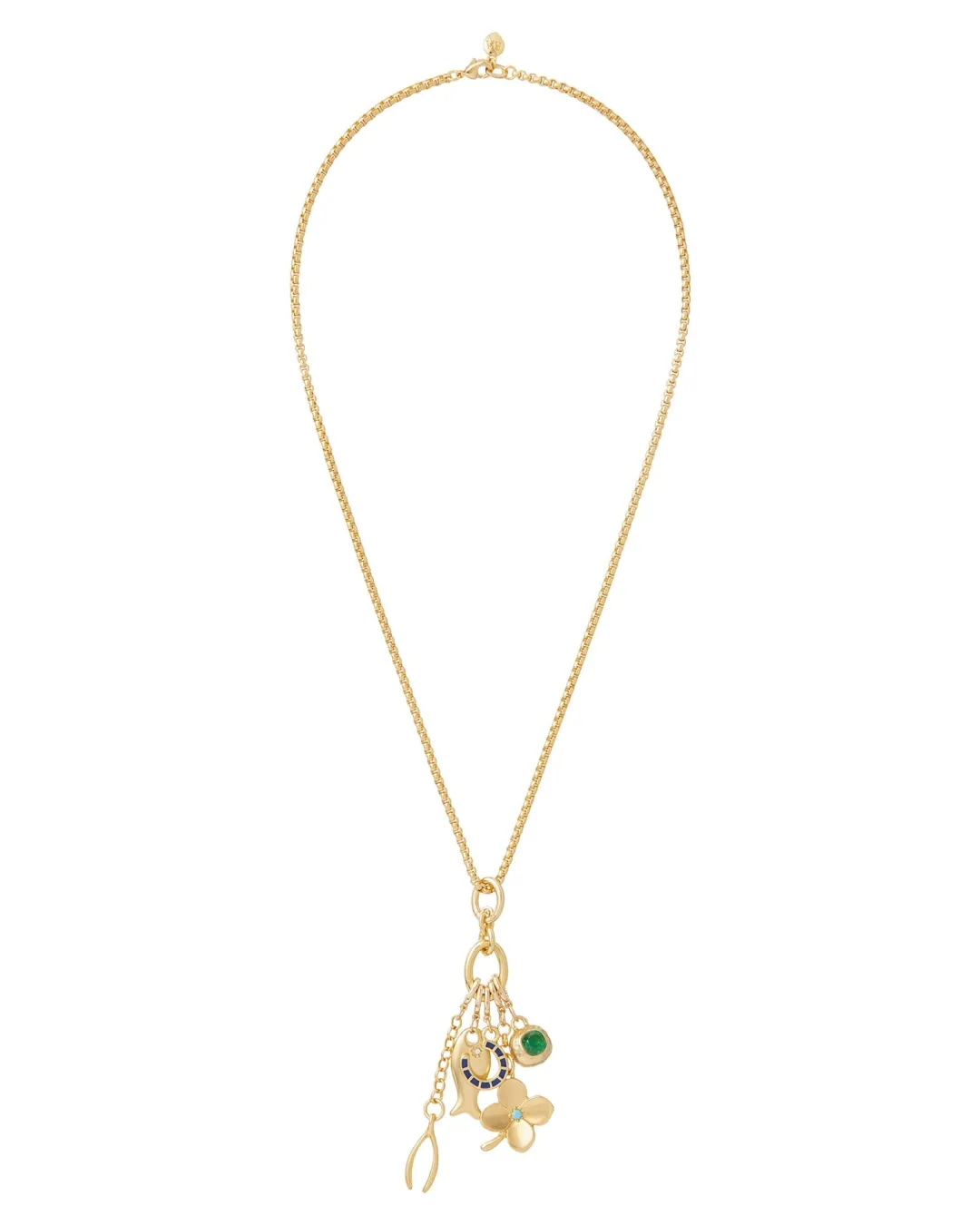 - Gold tone chain necklace with fish, wishbone, horseshoe, clover, and emerald hammered ball good luck pendant charms