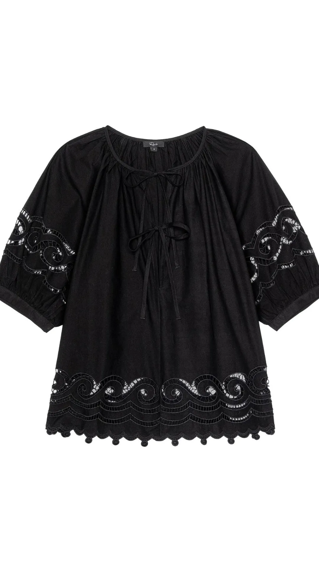 Crafted of lightweight cotton, Rails’ Catalene blouse showcases a tie-front silhouette with a versatile neckline and delicate lace detailing at the cuffs and hem.