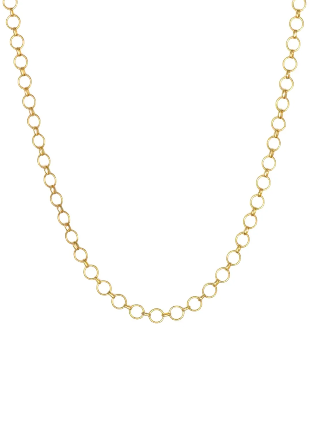 The Classic High Polish Round Loopy Chain in 14K yellow gold is a playful twist on timeless elegance. At 16 inches, this necklace drapes beautifully at the collarbone, creating a focal point of subtle intrigue.