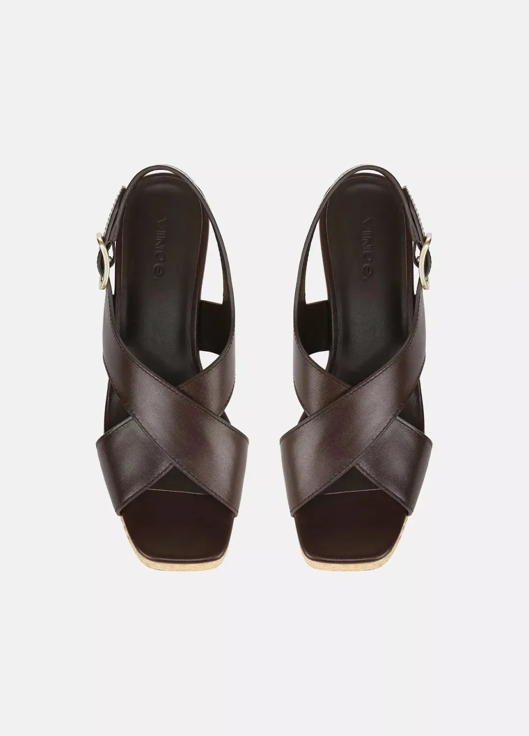 Smooth leather overlapping straps hug the foot atop a platform midsole crafted from textural woven raffia.