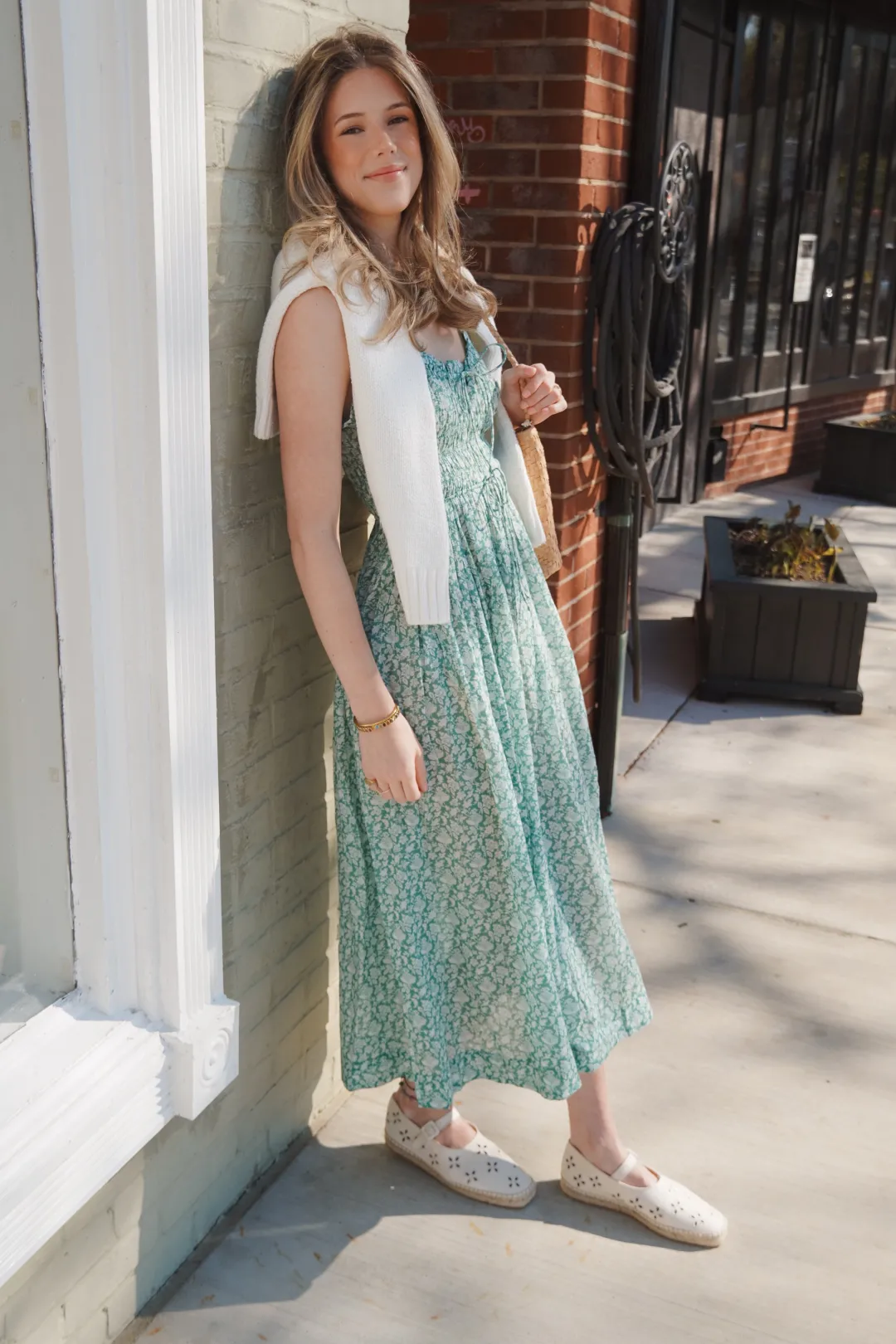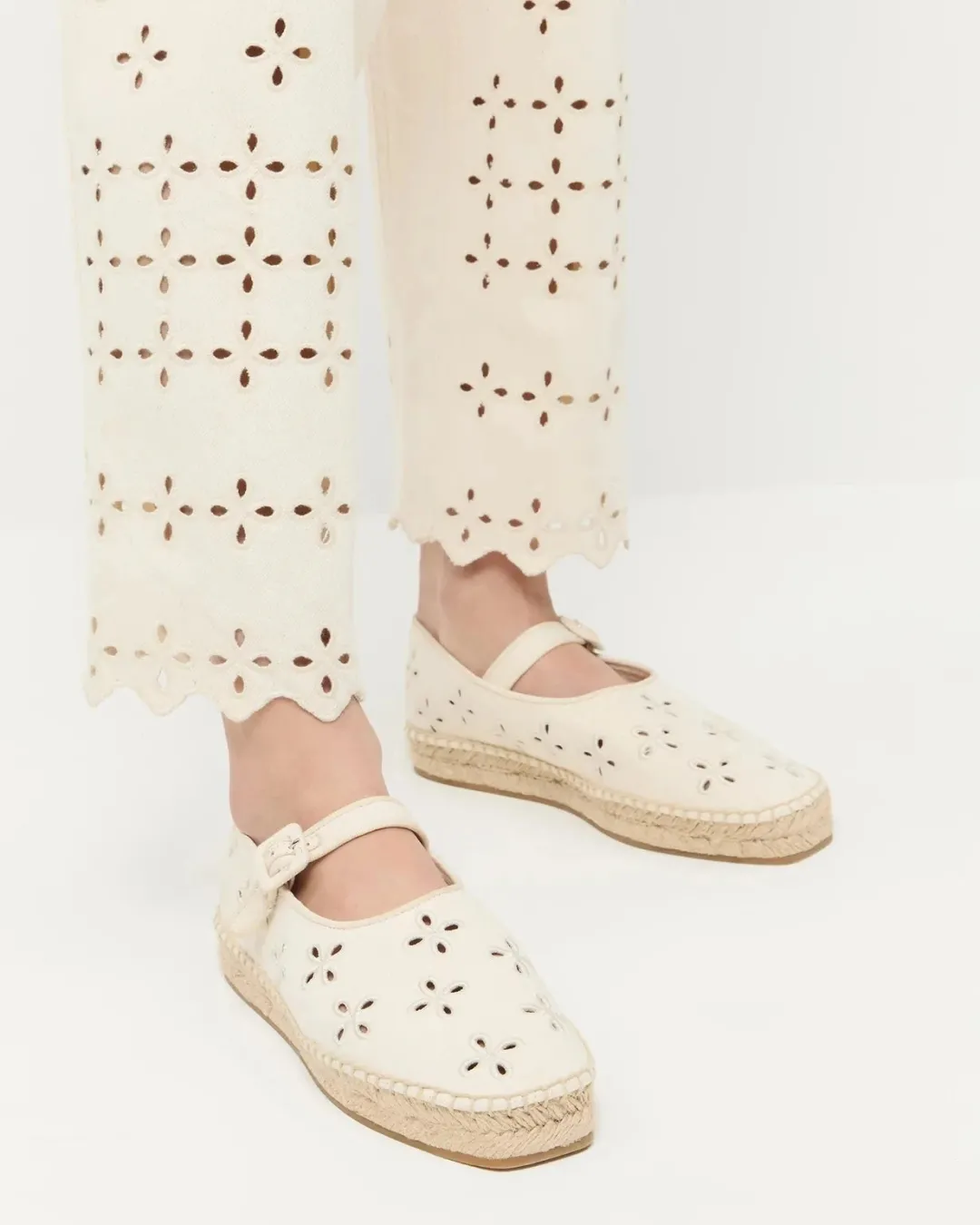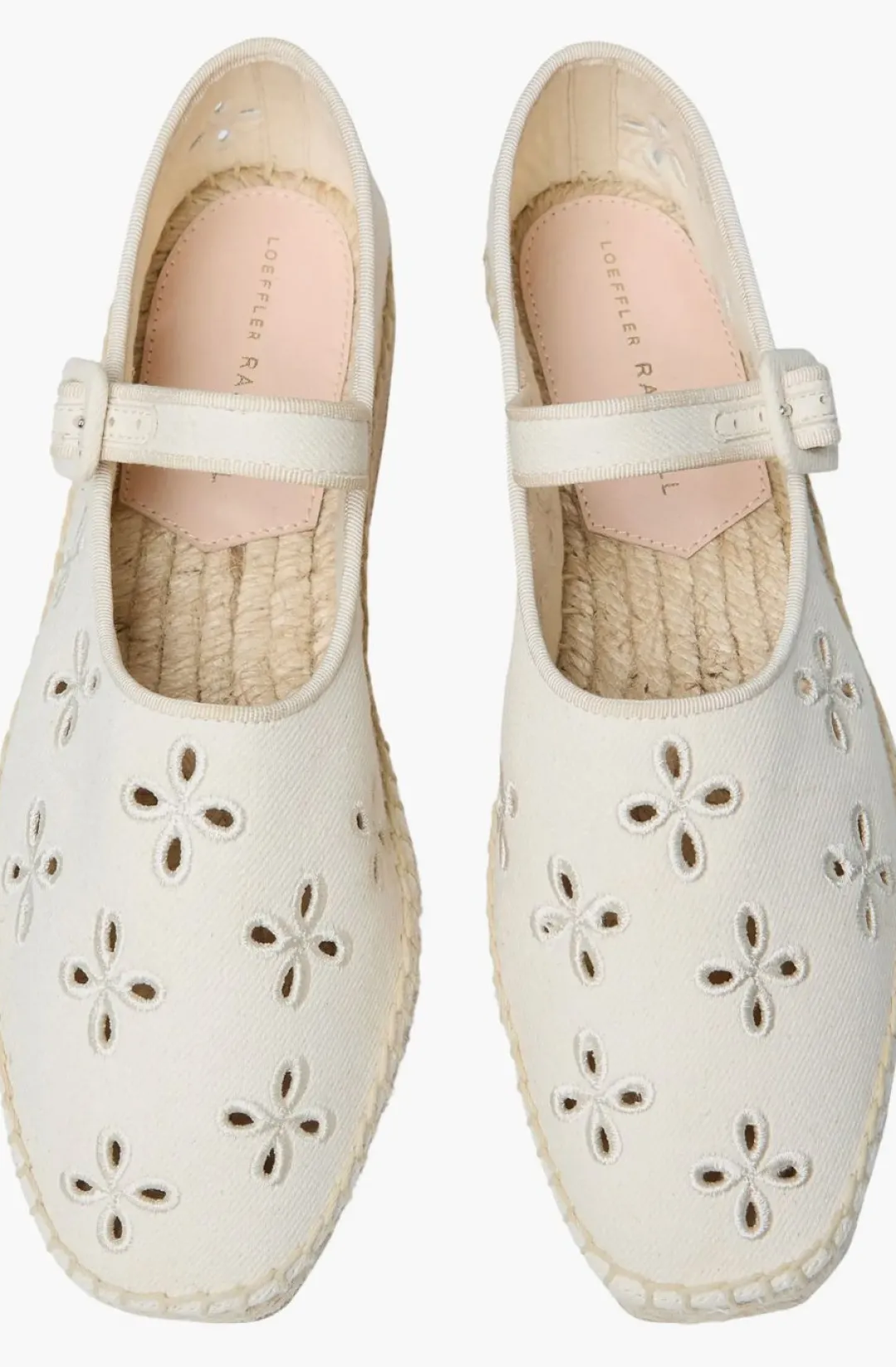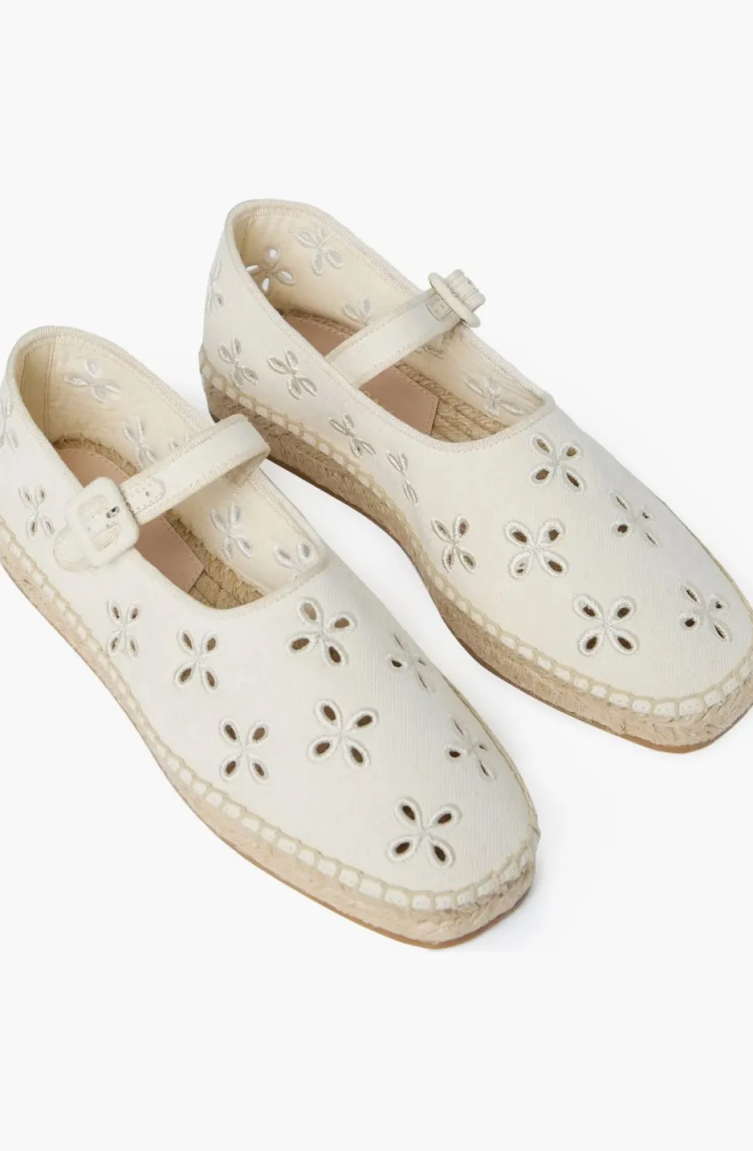 Decorative floral eyelets add a dose of whimsy to an espadrille-inspired flat set on a jute-wrapped platform and secured with an adjustable mary jane strap.