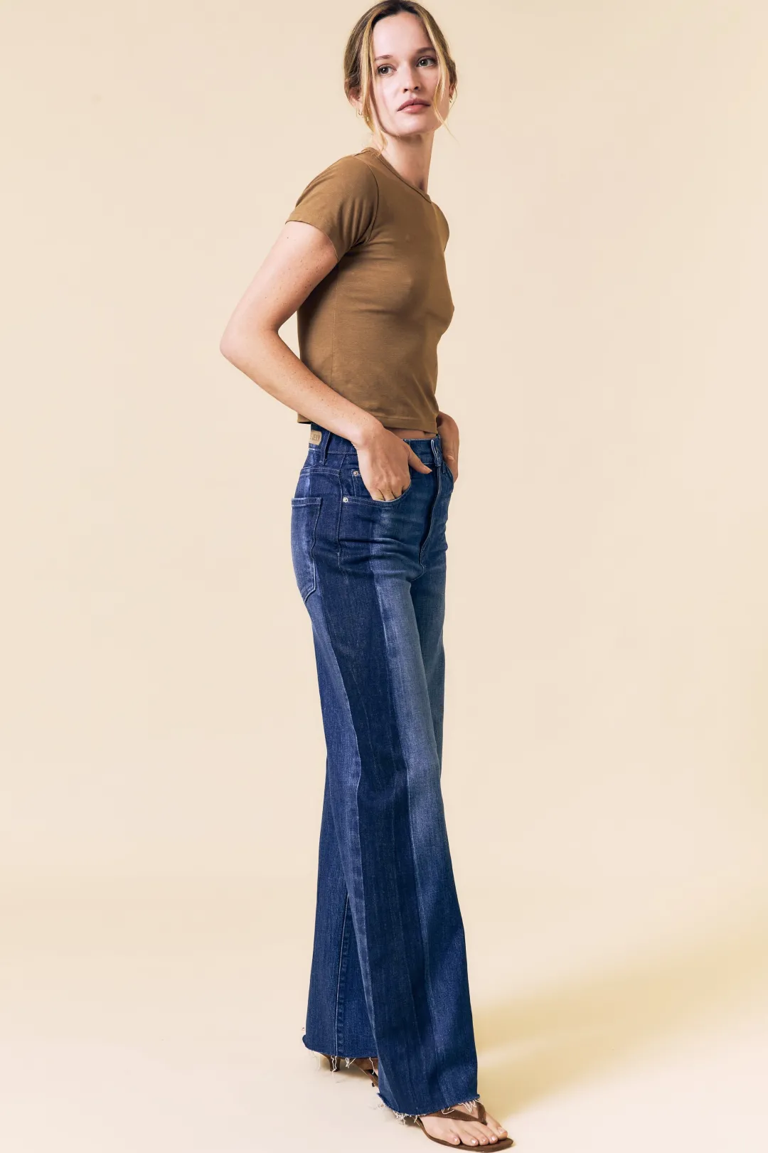 - High rise wide leg jeans with tuxedo stripes/contrast wash