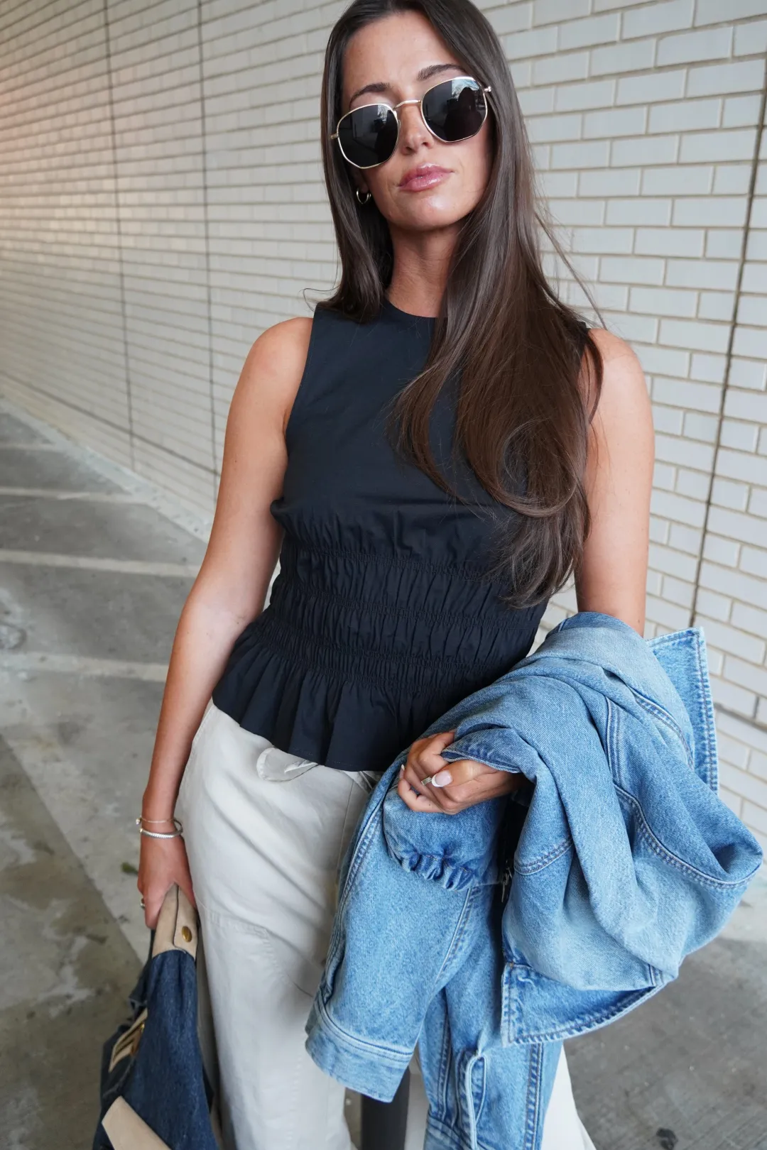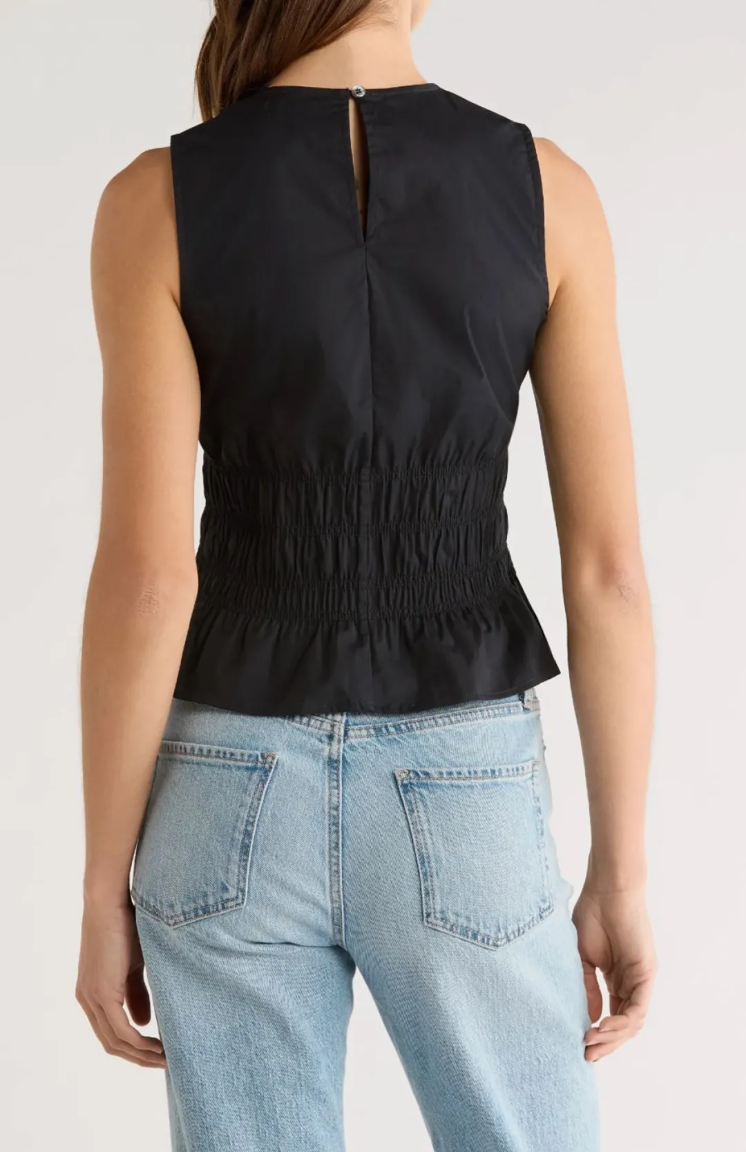 Waistline smocking sweetens the silhouette of this stretch-poplin sleeveless top finished with a frilled hem.