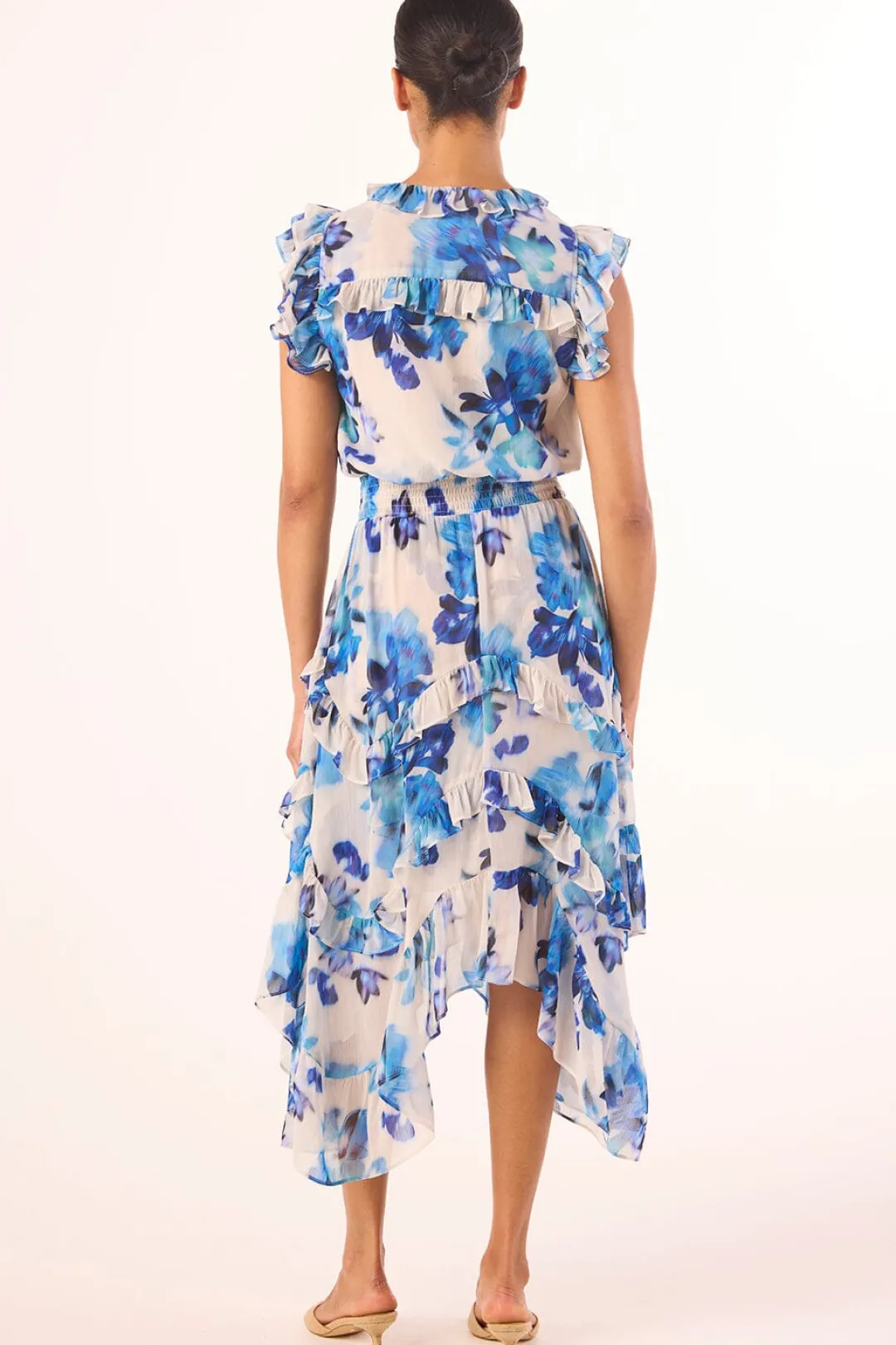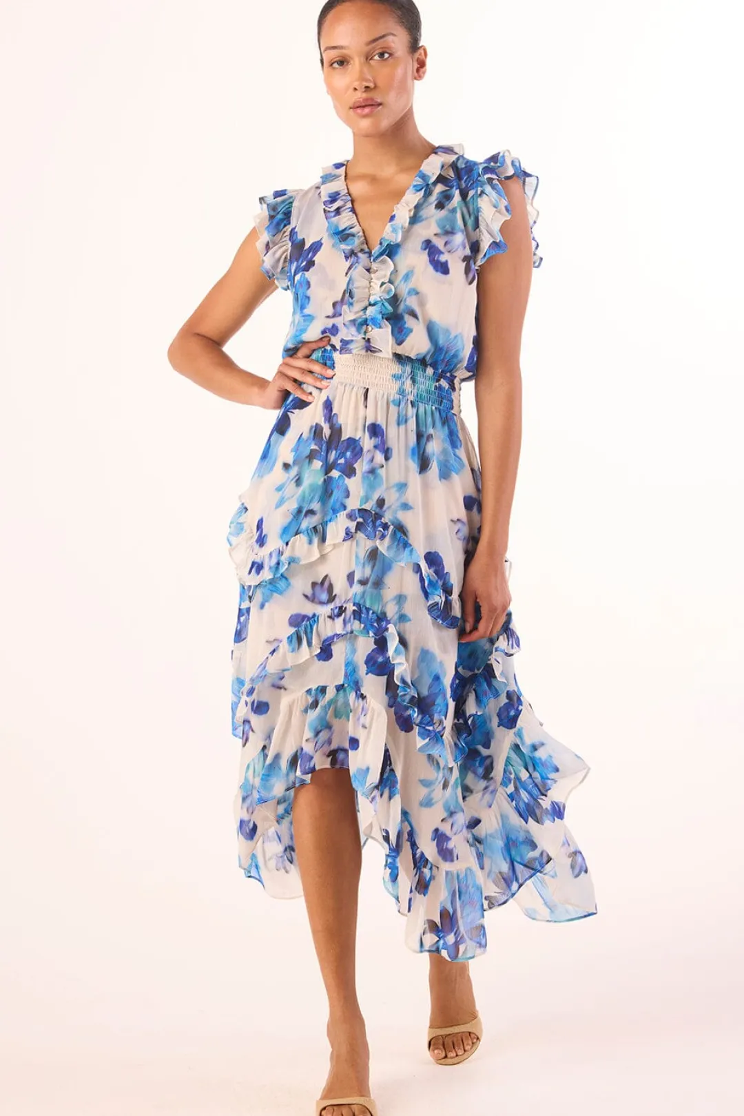 Chic and universally flattering, the best-selling Dakota is a playful yet polished midi dress designed for all seasons. Cut from blurred bouquet–printed chiffon, it features a buttoned V-neckline framed with soft ruffle trim and delicate ruffle accents at the shoulders. A smocked elastic waist defines the silhouette before flowing into a tiered skirt finished with ruffle detailing.