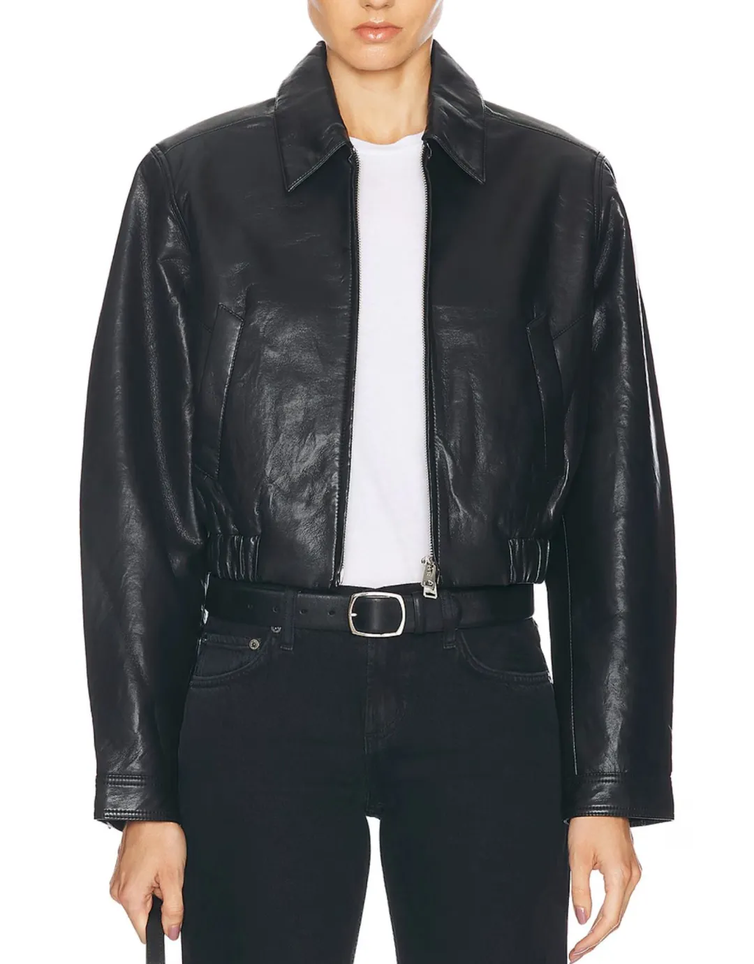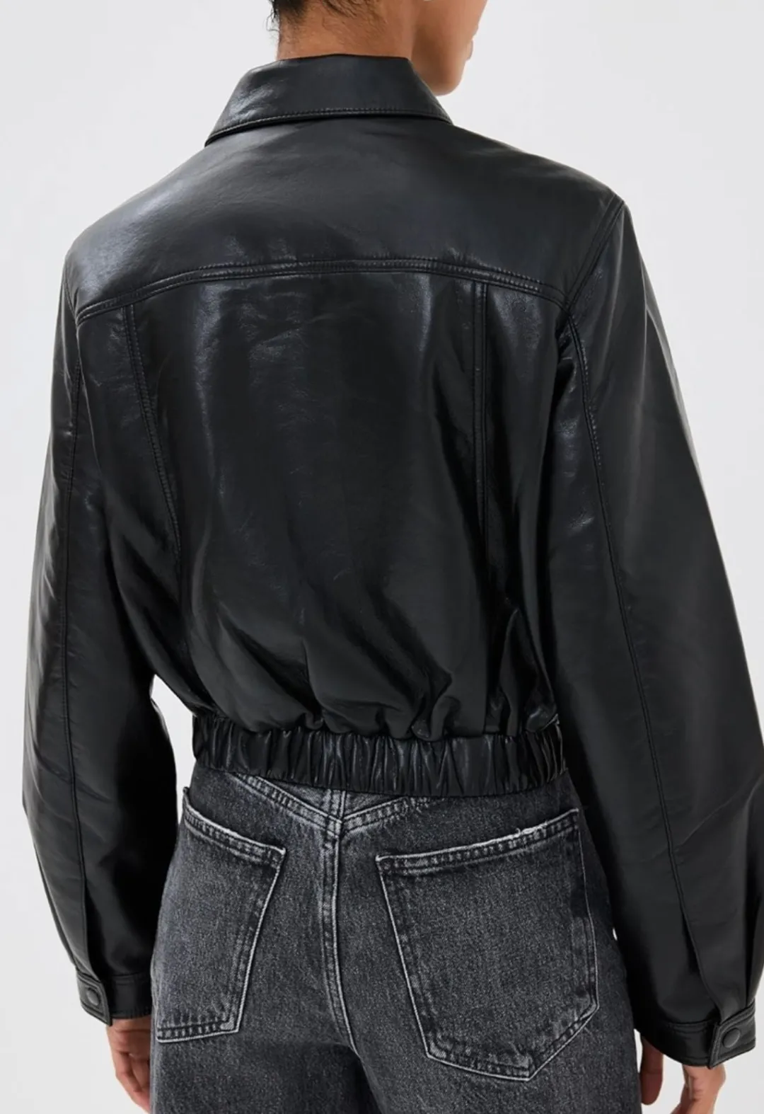A slightly cropped length adds a refreshing twist to the classic look of an easygoing zip-front jacket fashioned with recycled leather.