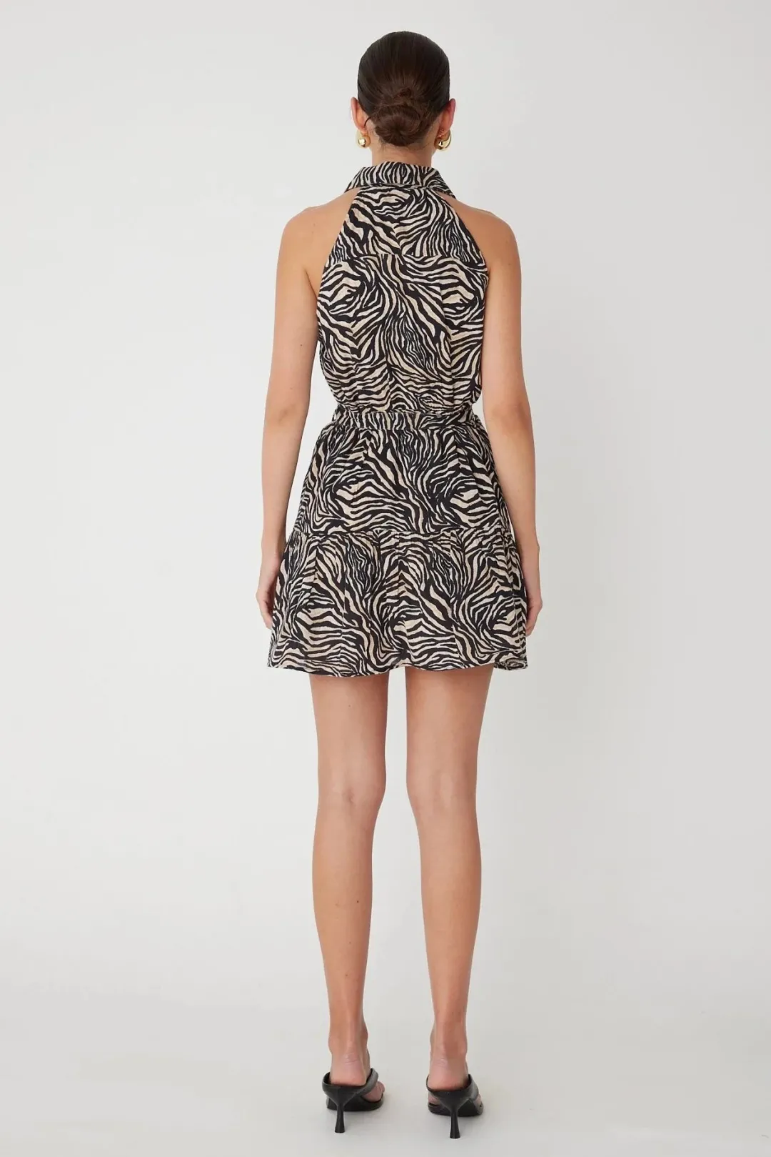 Experience effortless sophistication with the Finn dress, crafted from lightweight cotton gauze. The striking zebra motif in black and tan creates visual intrigue, while textured gold buttons add a refined finishing touch. The halter neckline elegantly frames the shoulders and neck, offering both flattery and ease of movement. This dress transitions beautifully from daytime leisure to evening sophistication when styled with your favorite sandals or accessories.