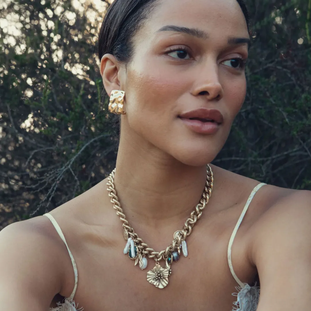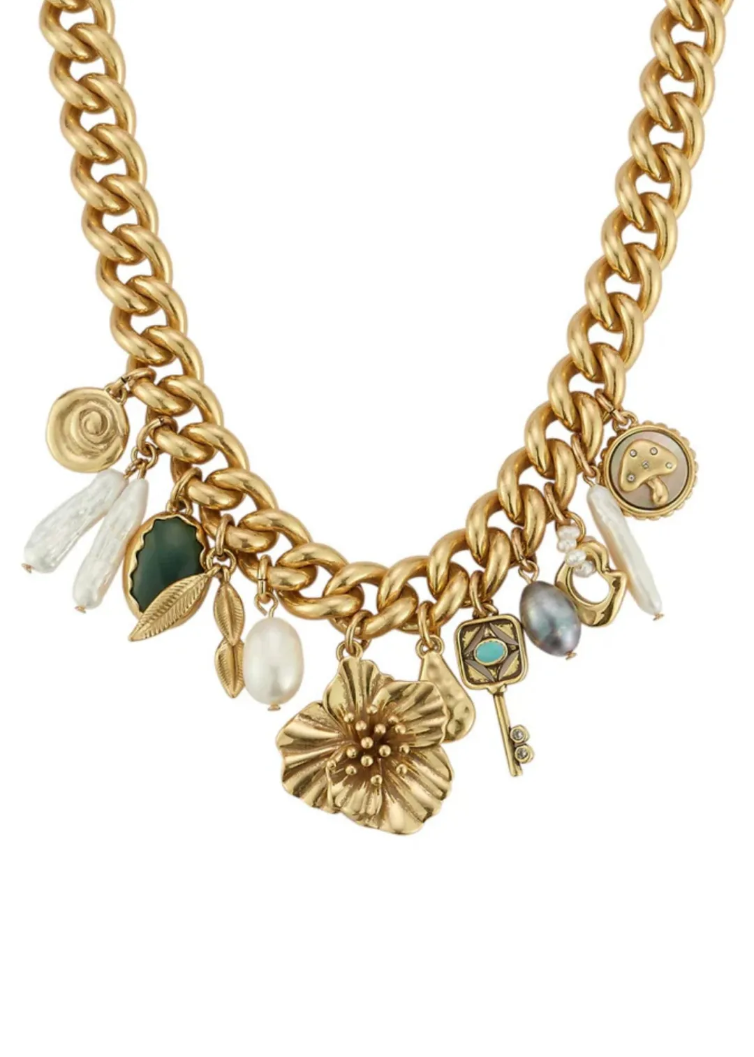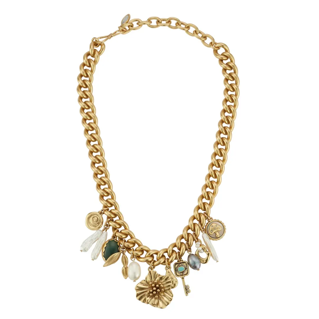 A bold curb chain adorned with eclectic charms. Sculptural blue and green florals, a key, luminous pearls, and natural stones, this antiqued gold necklace feels like a treasured heirloom with a modern twist.