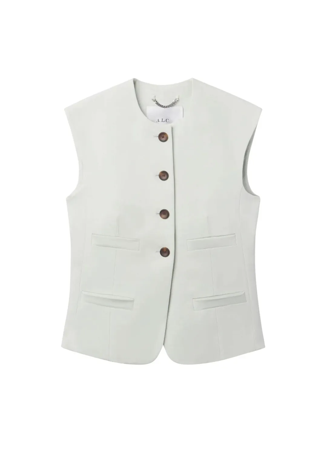 The Georgie Vest is crafted from a matte linen viscose in a pale mint hue. This tailored silhouette features a crew neck, button-front design, welt pockets, and shaping seams.
