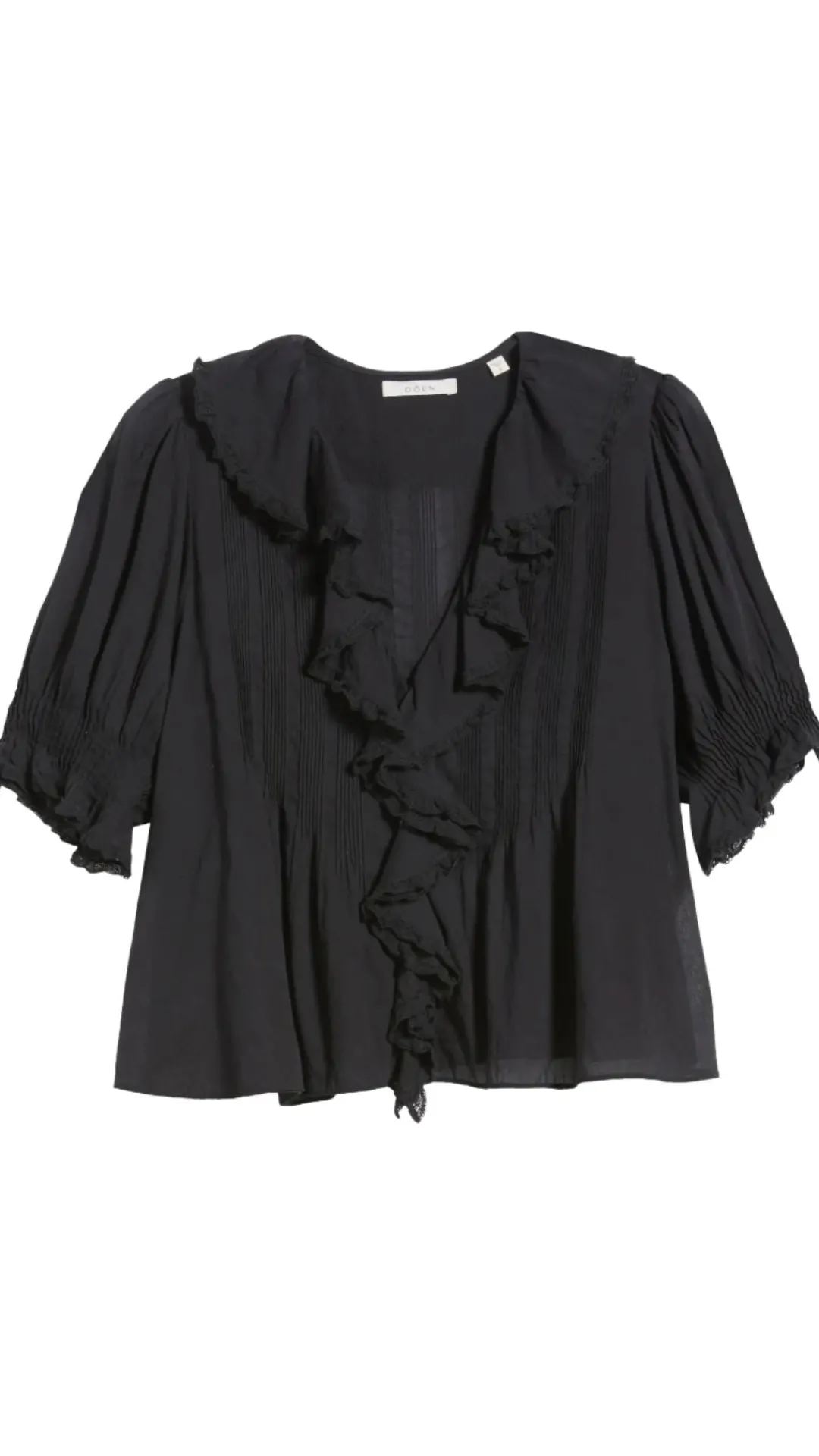 The cult-favorite Cali label’s retro/romantic aesthetic pervades every stitch of this ever-enchanting organic-cotton voile top decorated in cascading, lace-trimmed ruffles and scores of delicate pintucked pleats.