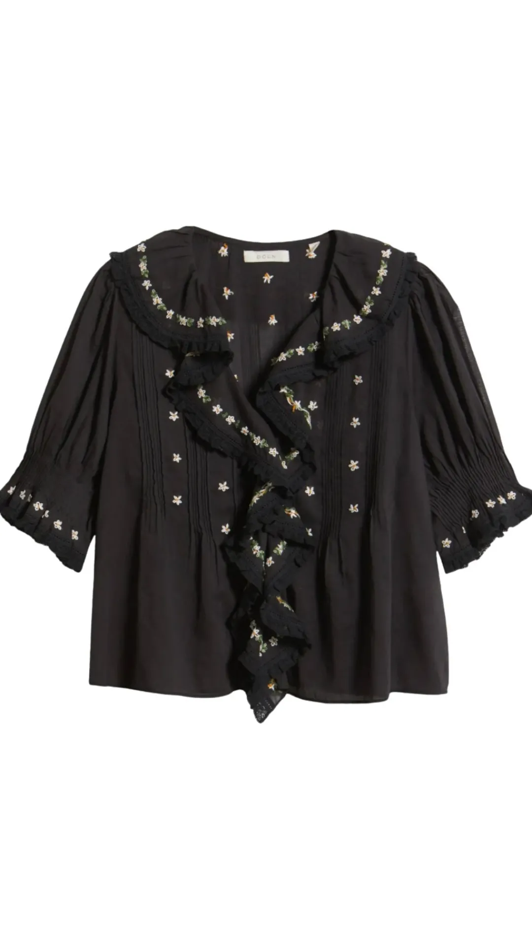 Flowery stitching charms this light and airy top framed by puffed elbow-length sleeves and accented with fluttering frills.