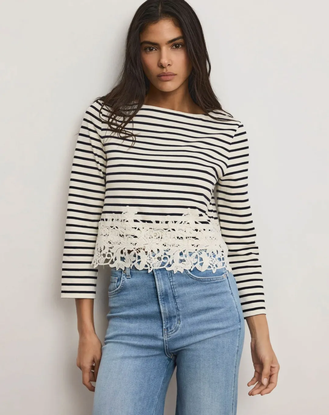 A feminine take on nautical stripes. Made from soft cotton jersey, the navy-and-white Hovey T-shirt is a long-sleeve marinière top with a band of floral lace at the hem. The clean, casual silhouette keeps it versatile and wearable while the embellishment adds interest without excess. Pair with jeans or tailored denim to elevate the everyday.