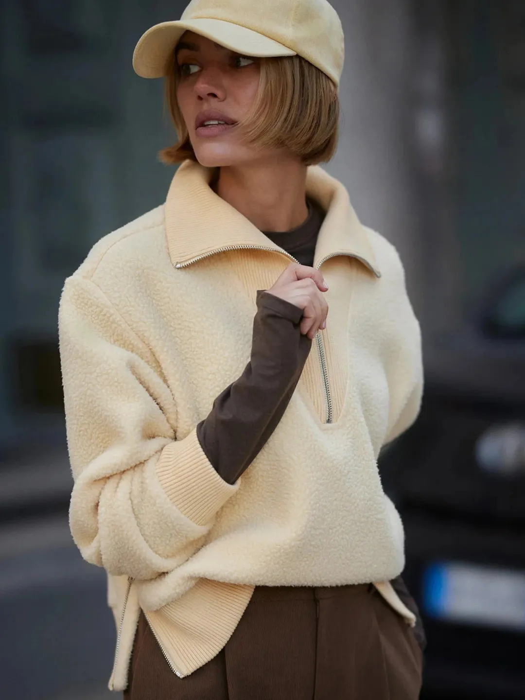 The Jaylin half-zip is crafted from a soft Plush Borg Fleece and cut to a relaxed fit – perfect for layering over your transitional looks or lounging in the winter months. The ribbed hem, cuffs, and the V-shaped rib panel around the collar add extra texture, while side zips at the hem set a subtle accent.