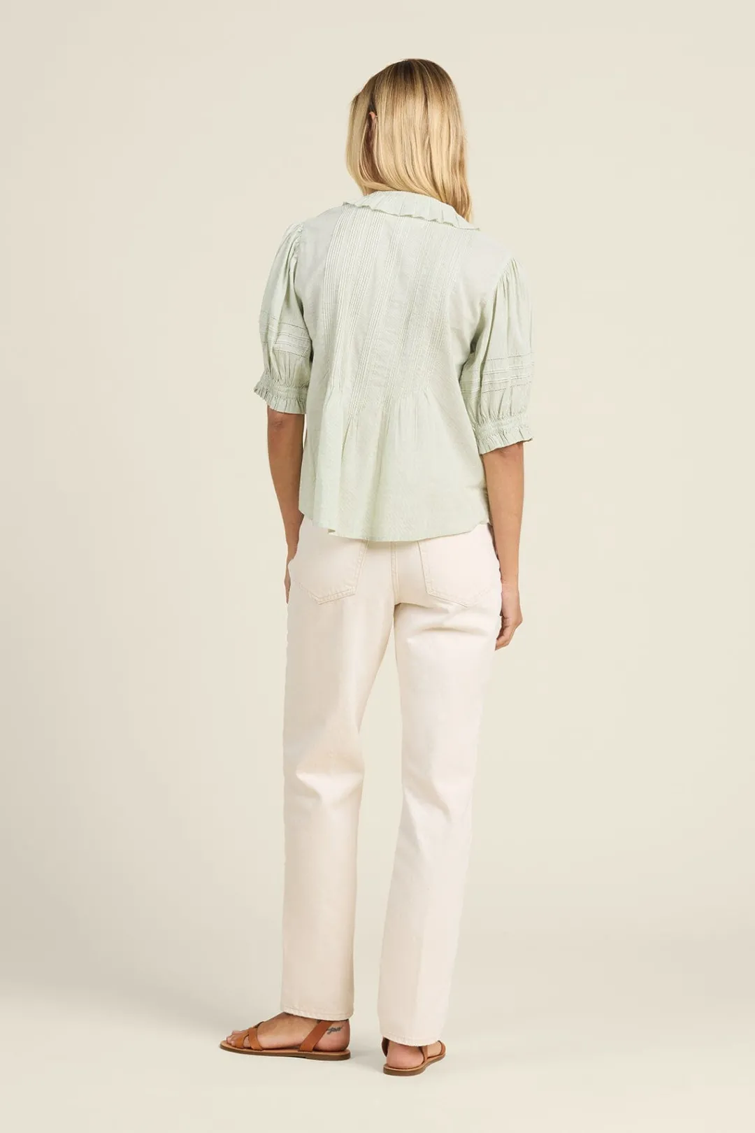 The Jess Blouse is our newest short sleeve top. Designed to be self-styled, featuring a flattering curved hemline and petite pintucks that lend texture and hand crafted charm. Slightly cropped length keeps this blouse airy and whimsical.