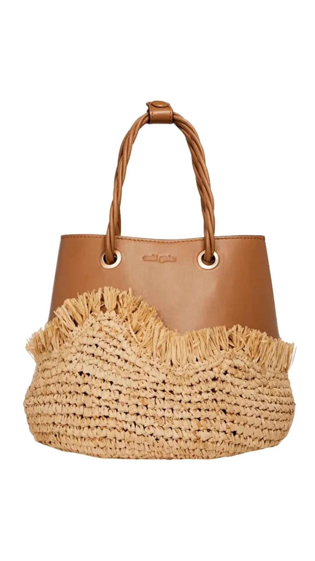 A mini bucket bag crafted from smooth leather with raffia fringe detailing and twisted leather straps.