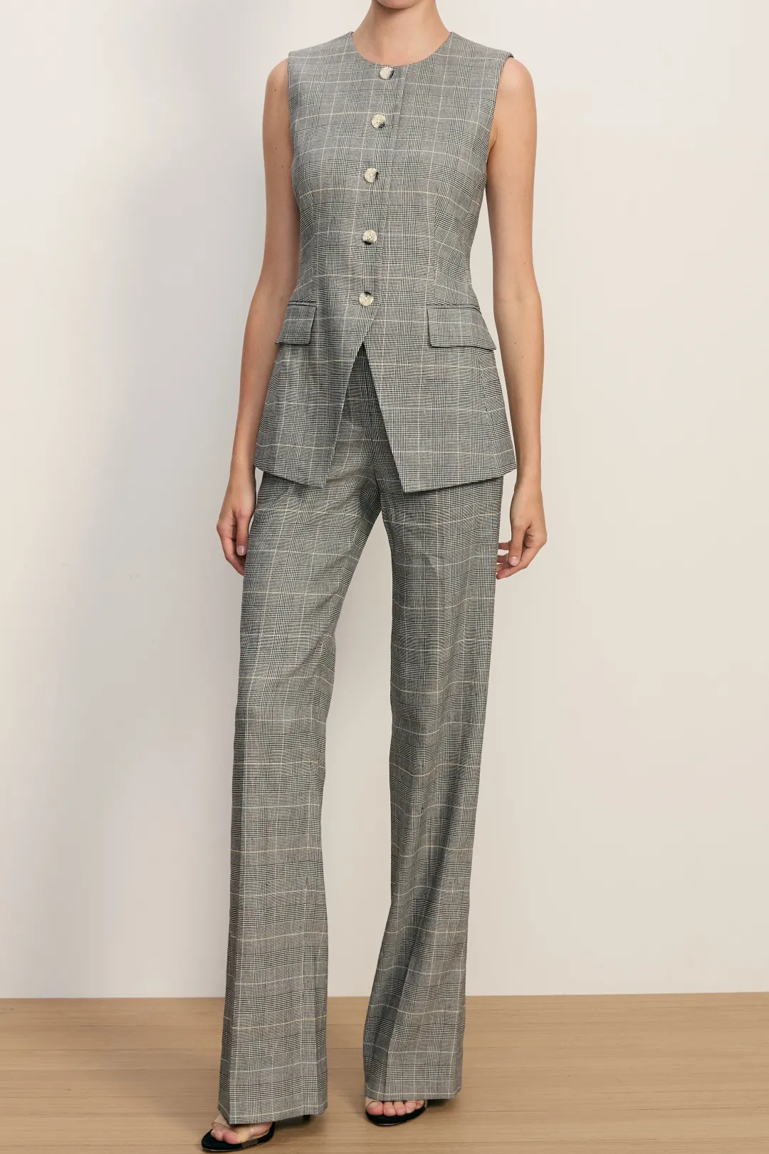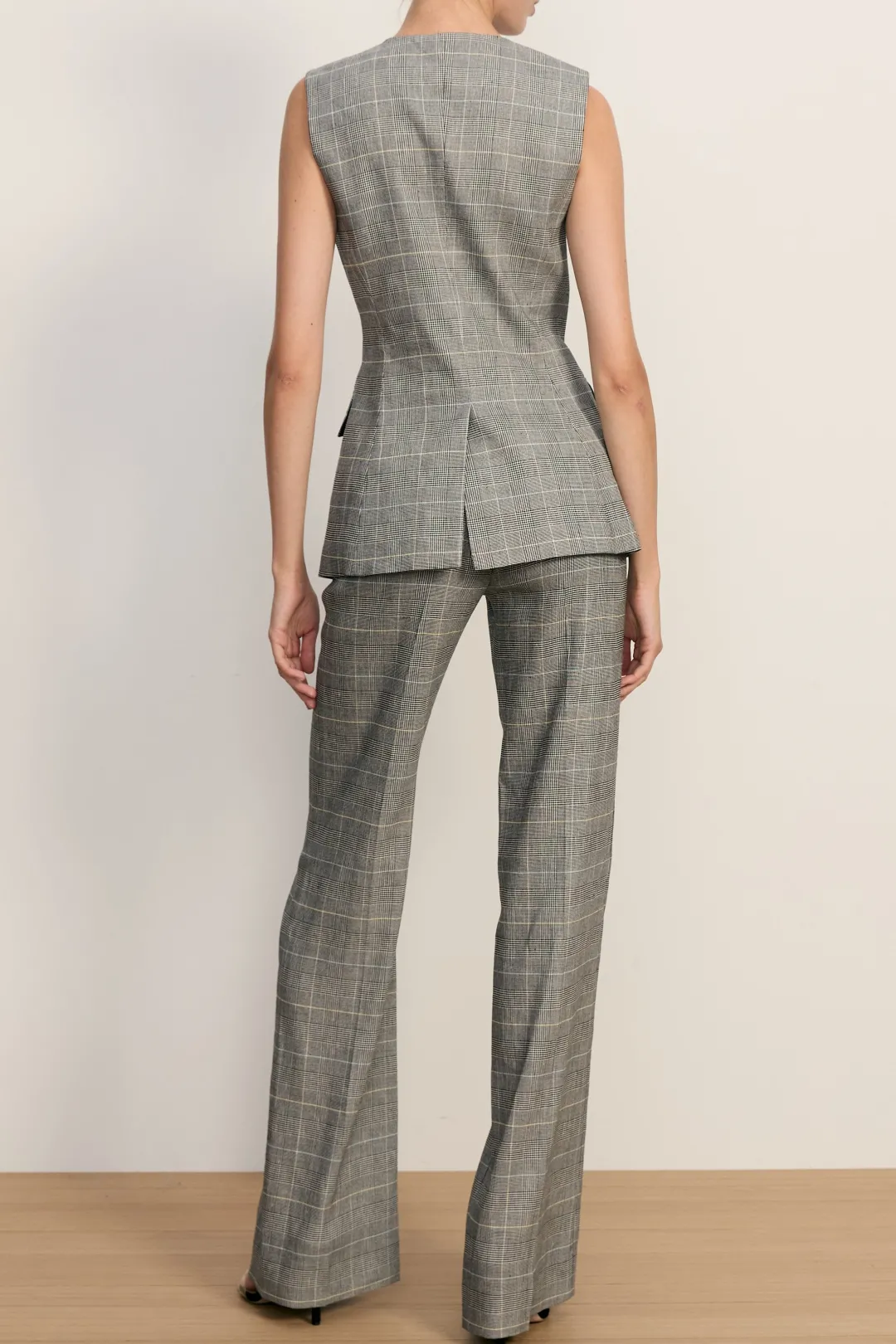 The perfect relaxed pant. The high-rise Jude is expertly tailored from Italian stretch linen in black-and-white grey glen plaid. It’s features a streamlined silhouette with a clean waistband and side slip pockets. Wear these plaid pants with a white button-down or monotone pullover—or, to double the impact, style with the matching Lois vest for a warm-weather spin on power suiting.