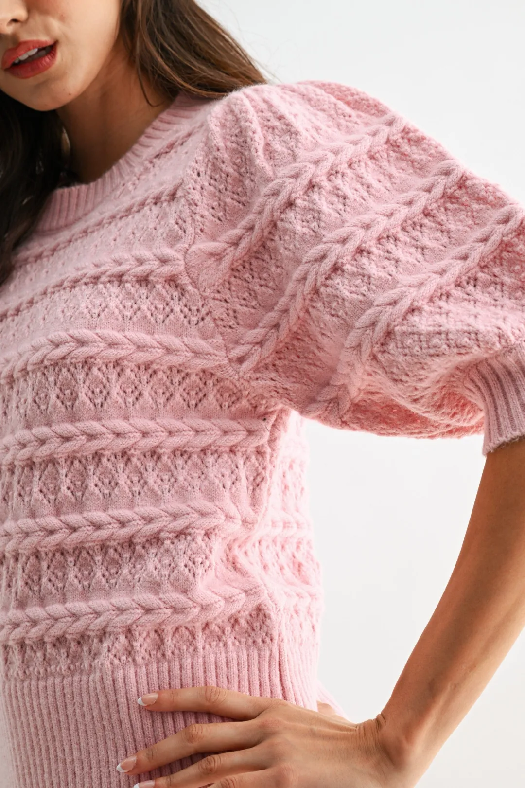 Elevate your wardrobe with this refined pastel pink cable knit sweater, designed for the discerning professional who appreciates both elegance and comfort. The contemporary three-quarter puff sleeves create an impression of modern sophistication, making this piece a seamless fit for business casual environments, creative offices, or upscale events.
