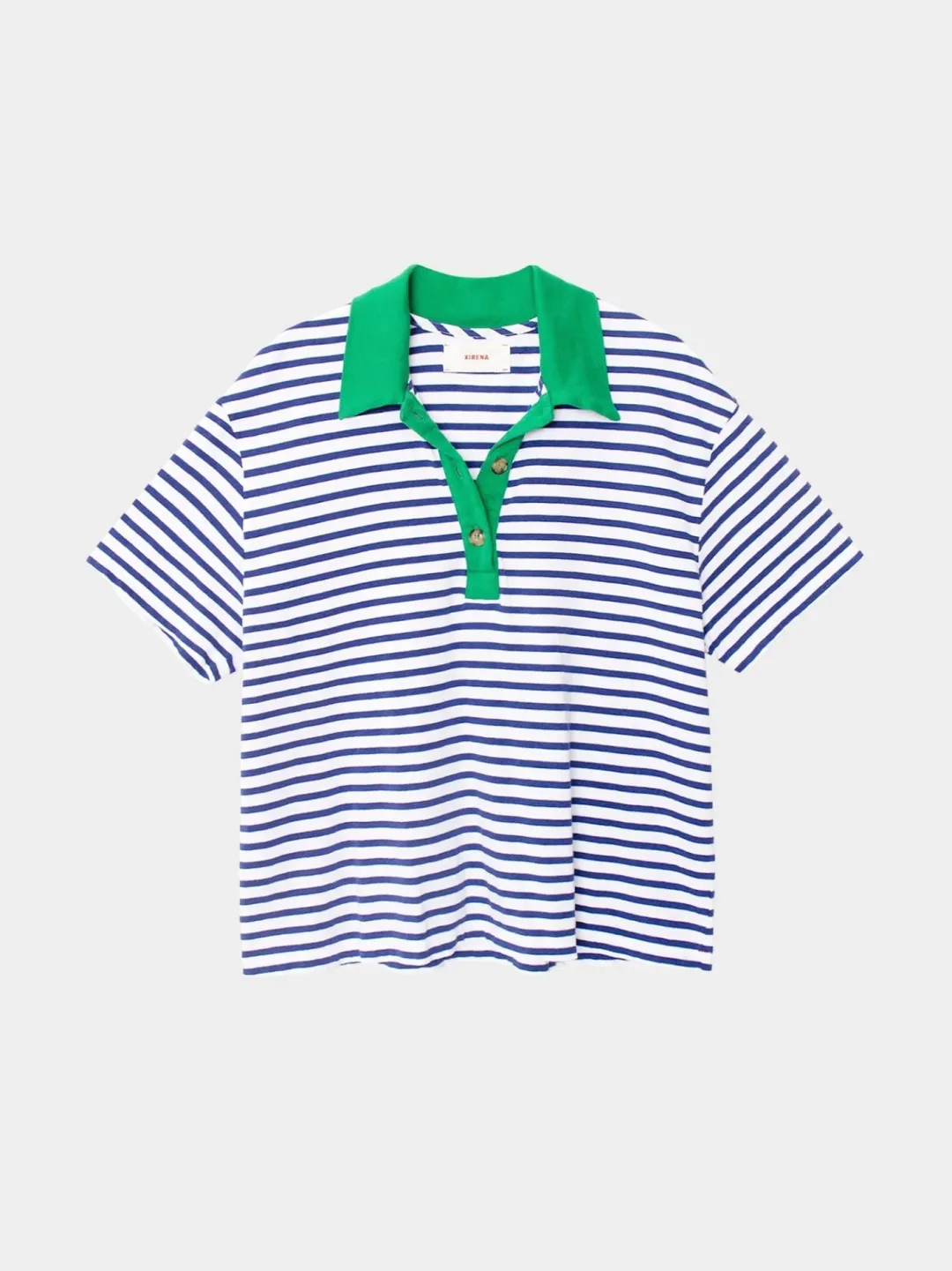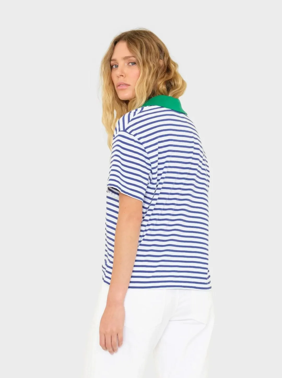 Back to Basics. Kellie is new this season in our ultra-soft striped cotton jersey. Kellie is a short sleeve polo tee with a faux horn button-front and contrast neck.