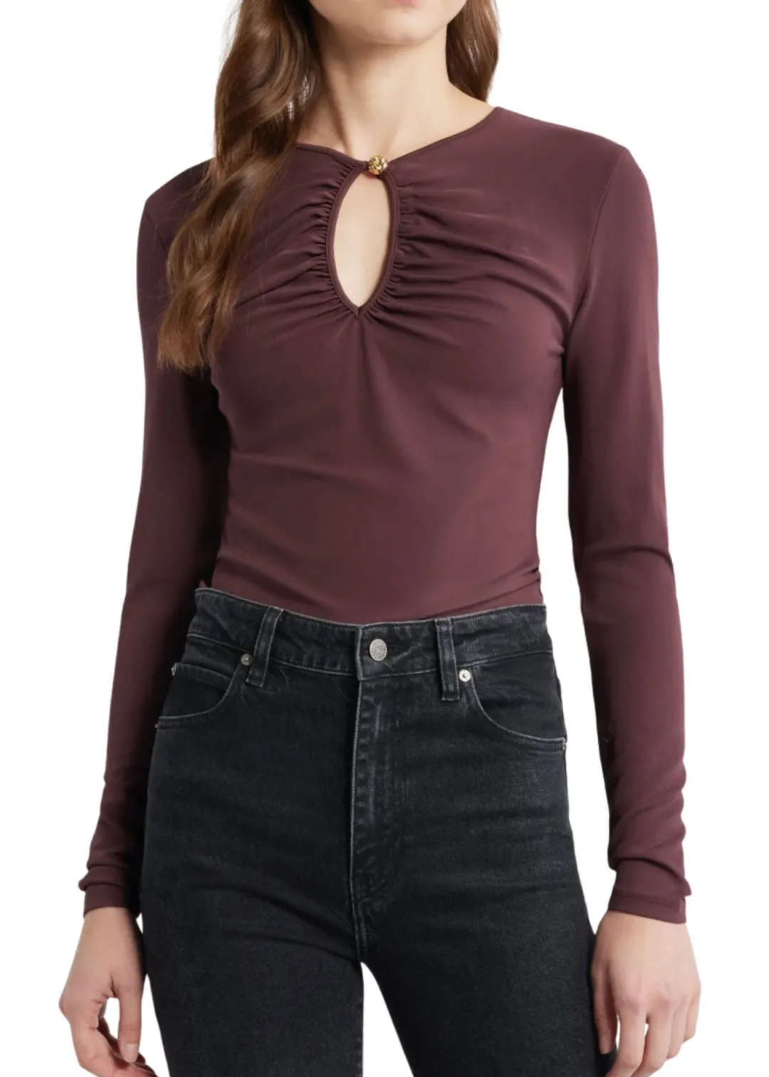 Made from comfortable jersey fabric, this form-fitting top features a peek-a-boo keyhole at the neckline detailed with a goldtone knot-button closure