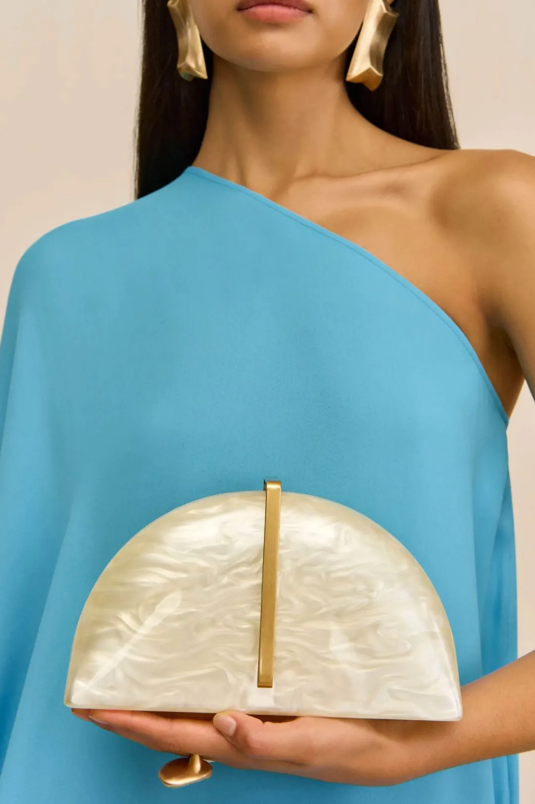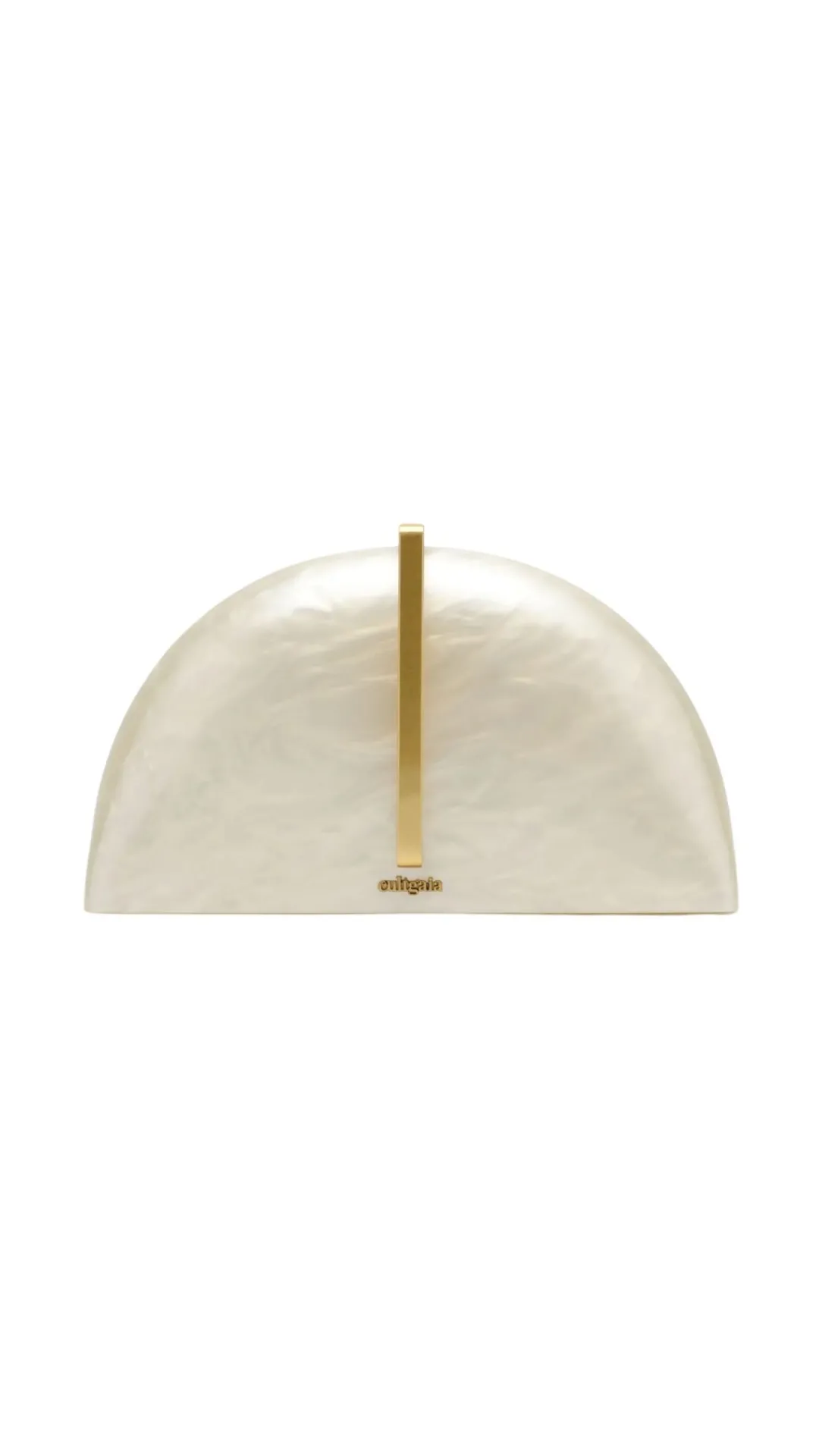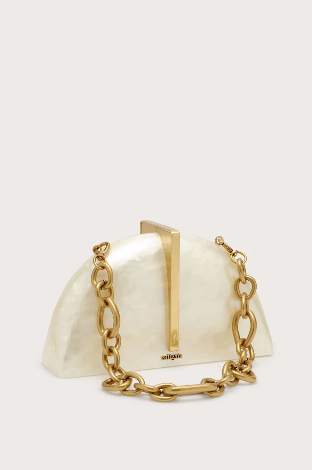 An ivory arch-shaped acrylic clutch with a removable chain strap.