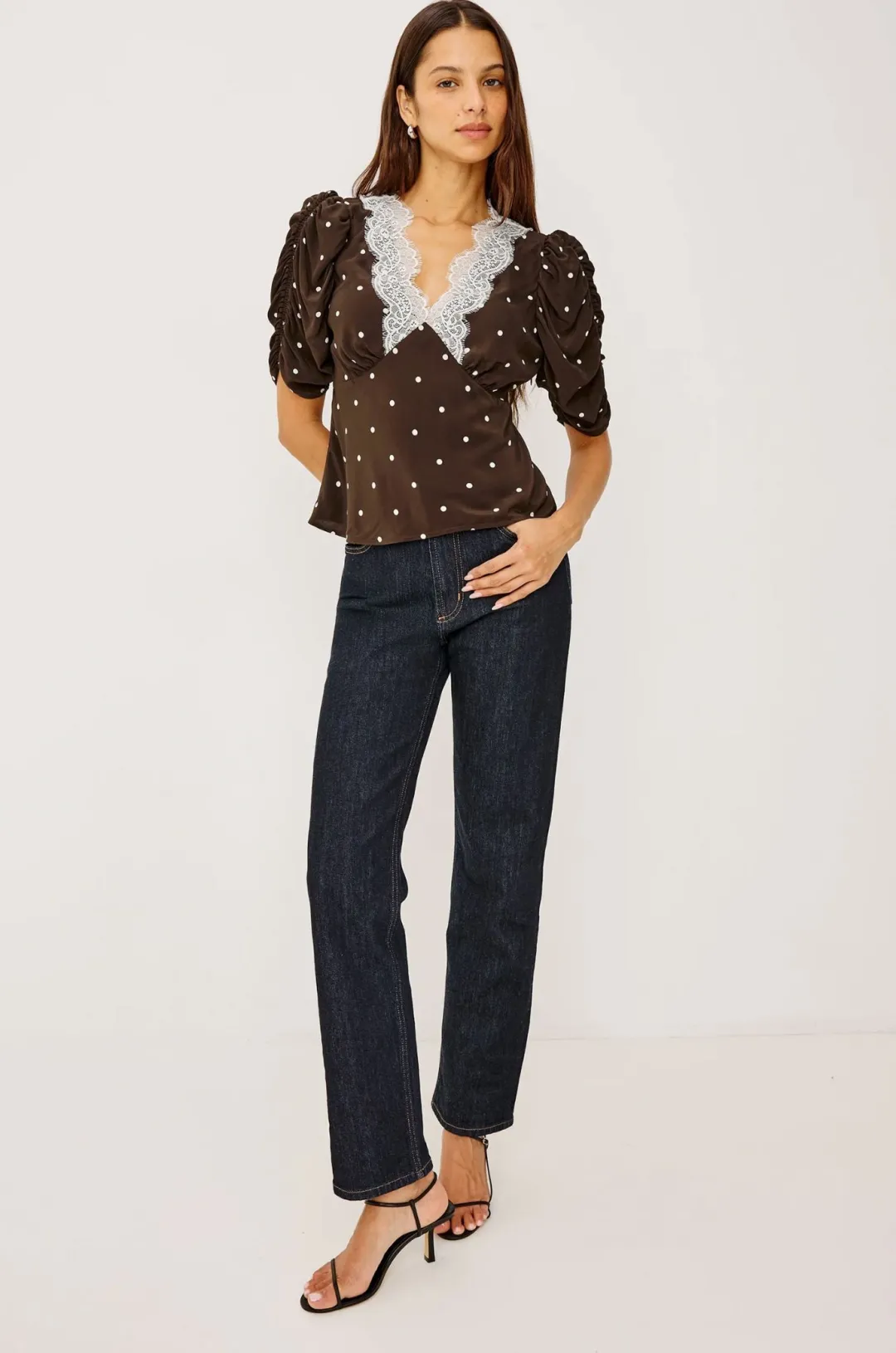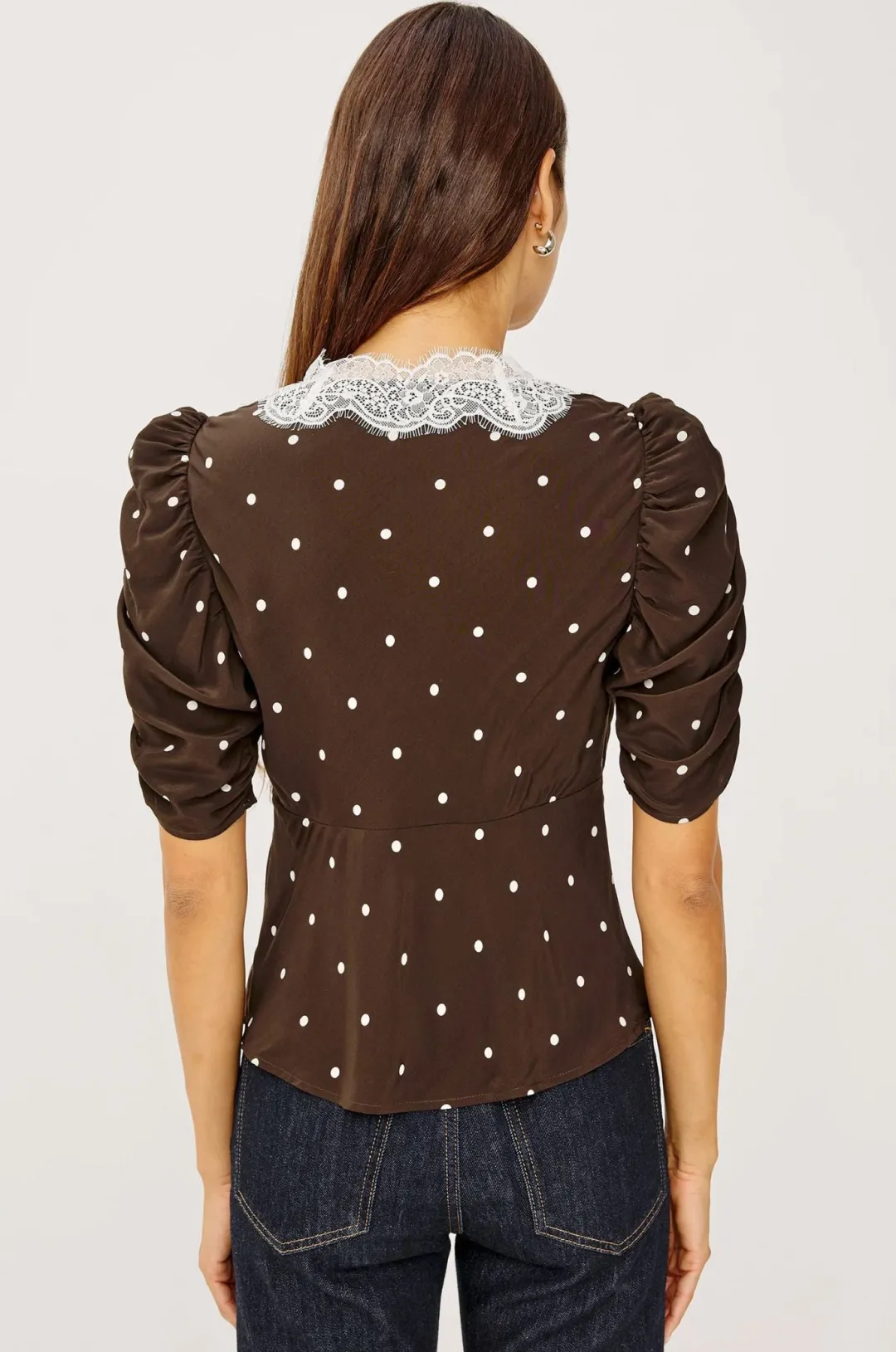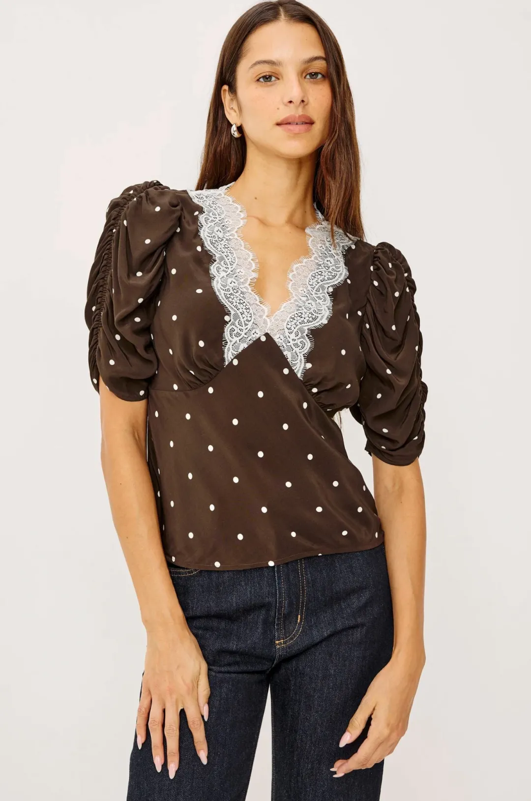 Cut from luxurious crepe with a subtle sheen and fluid drape, the Lazara captivates with a lace-trimmed V-neckline and charming polka-dot print. Three-quarter puff sleeves with gentle ruching add flattering shape and movement for versatile day-to-night sophistication. Chocolate brown/white.