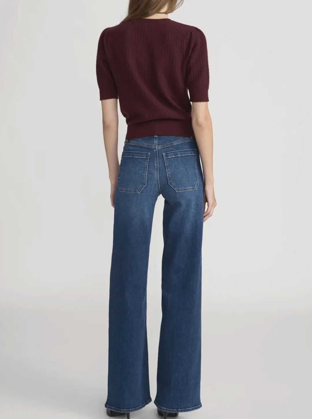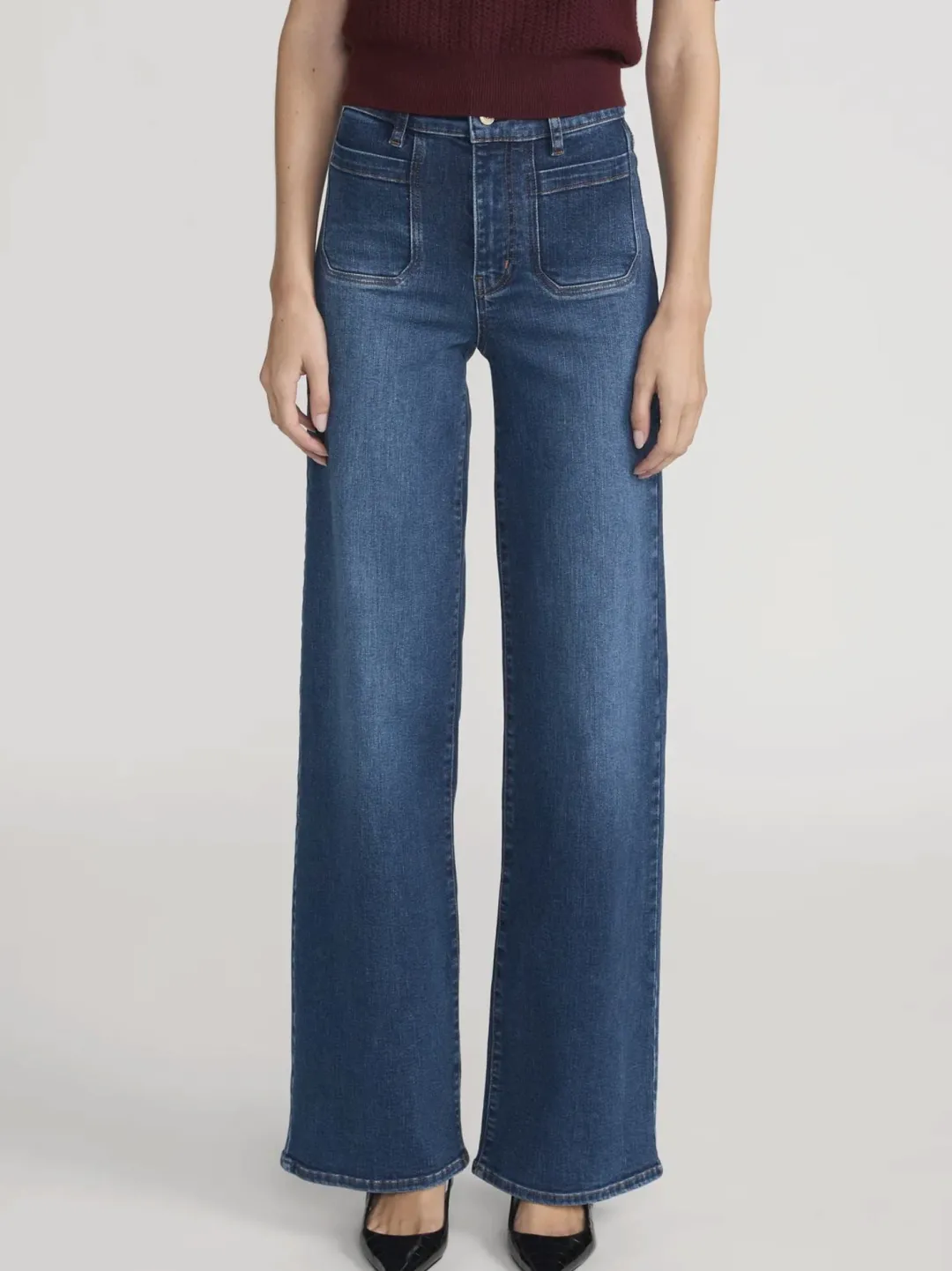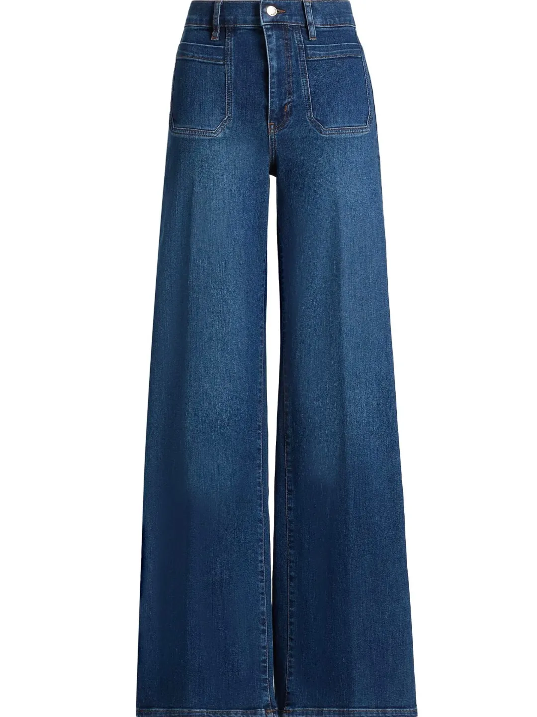 Inspired by ’70s styles, these full-length palazzo jeans are remade for today with superstretchy denim and squared-off patch pockets.