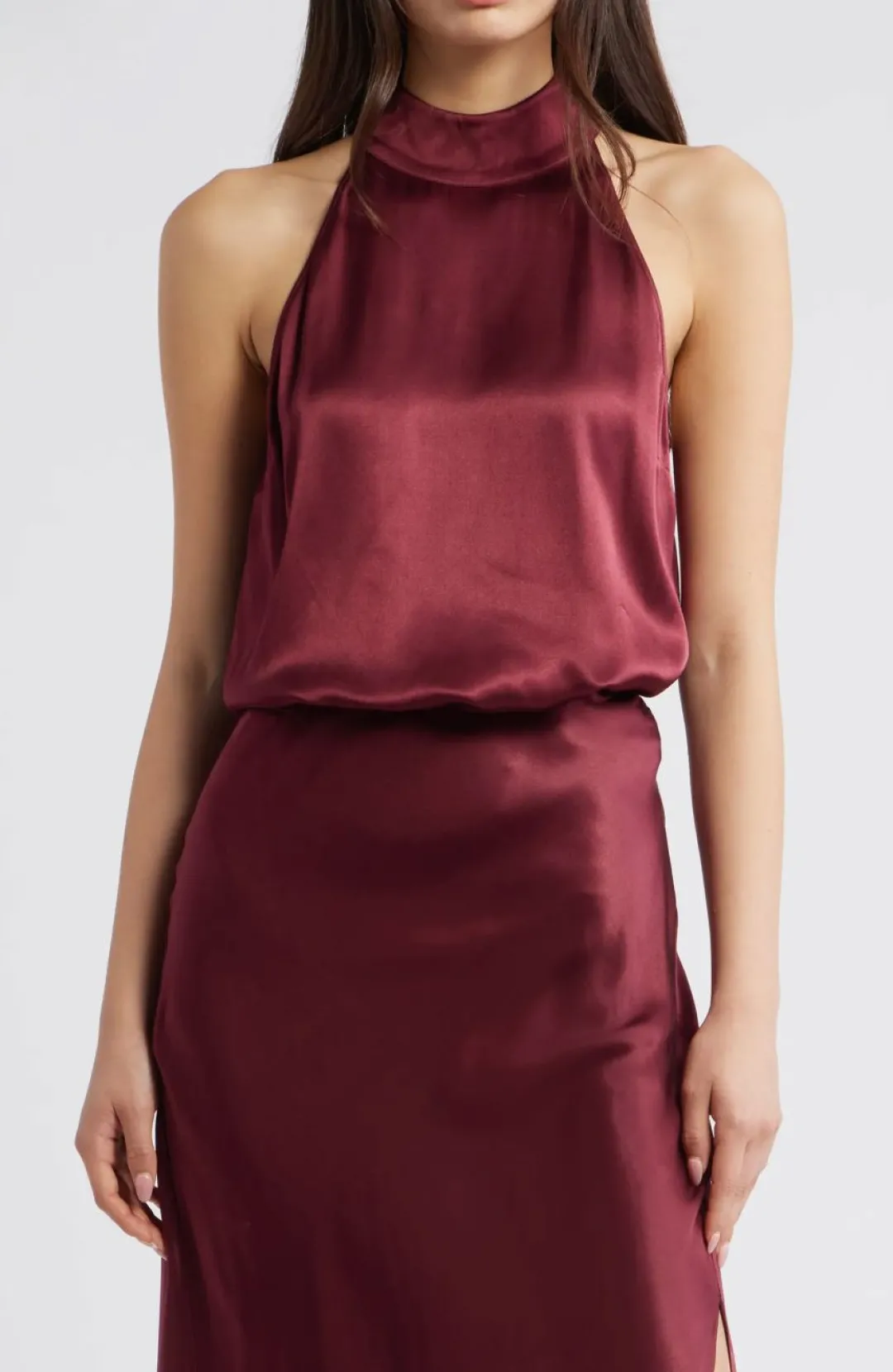 A fluid top featuring a high halter-style neckline and satin crepe in a gorgeous burgundy hue is an effortless way to bring timeless glamour to your look.