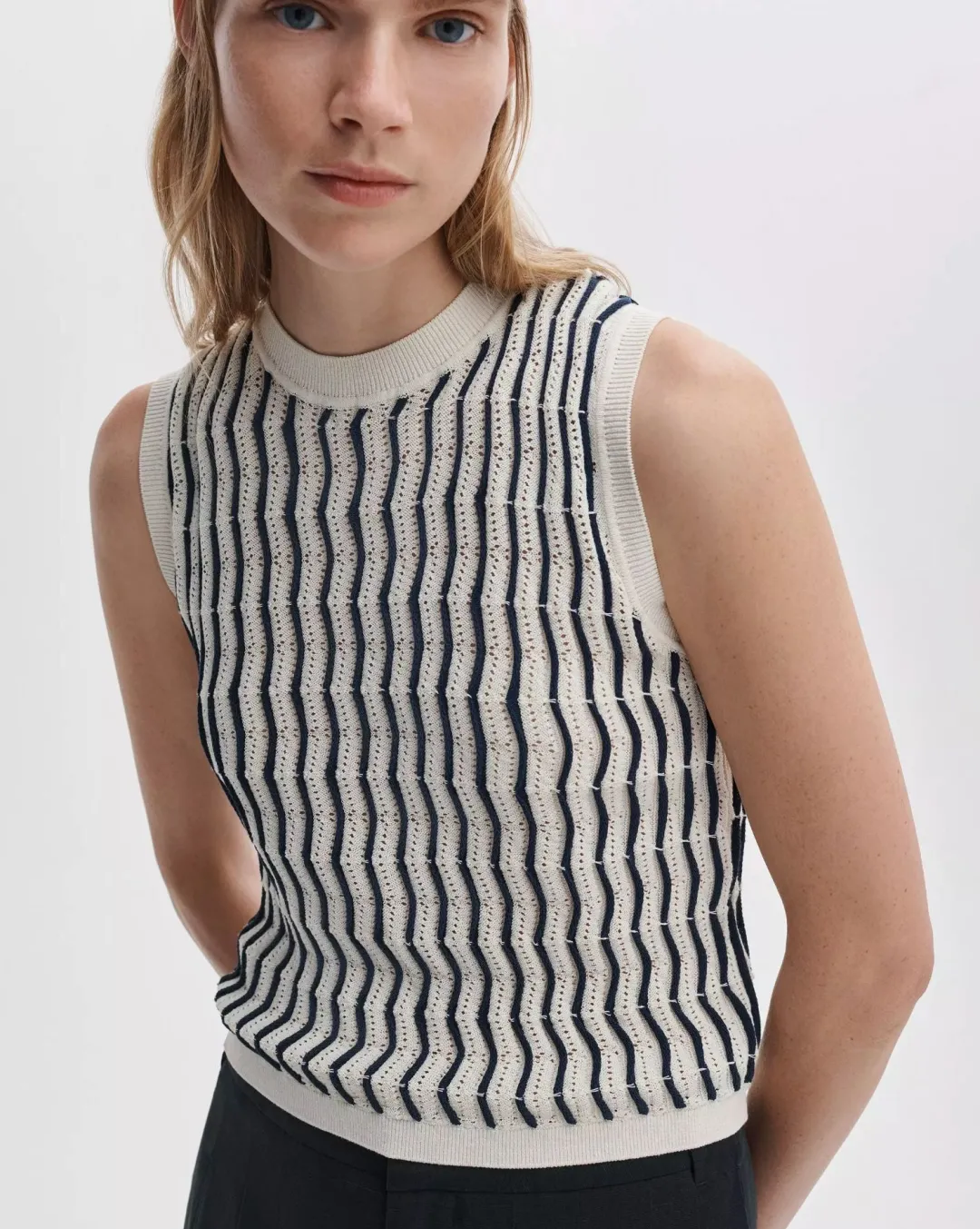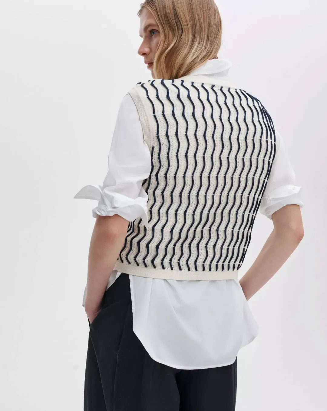 Classic with an edge. This slim-fitting vest combines pointelle and contrast zigzag stitches for a dimensional striped effect. Wear on its own, layered over a classic button-up, or under a blazer.
