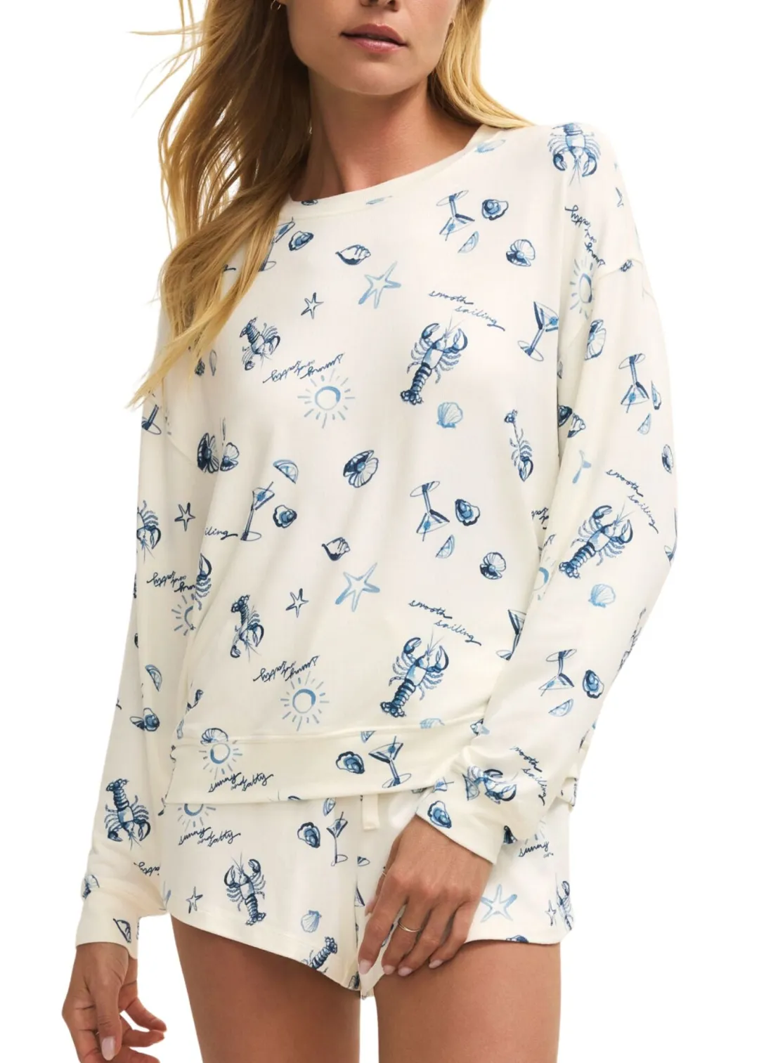 Our signature silky jersey gives this long sleeve crewneck its soft and cozy feel. The relaxed fit makes it perfect for lounging at home or even on vacation with its seaside inspired print. Pair with its matching bottom to complete the look.