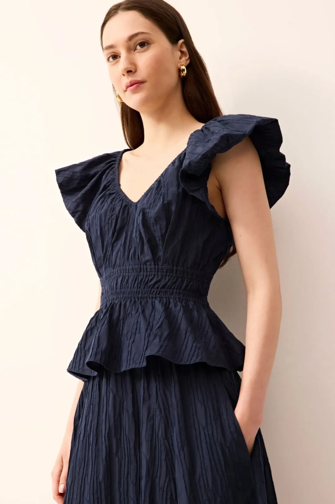 This feminine warm-weather top is defined by puff sleeves, gathered detailing, and a textured crinkle cotton fabrication that adds subtle interest. Offered in Naval blue, it pairs naturally with the coordinating Sasha skirt.