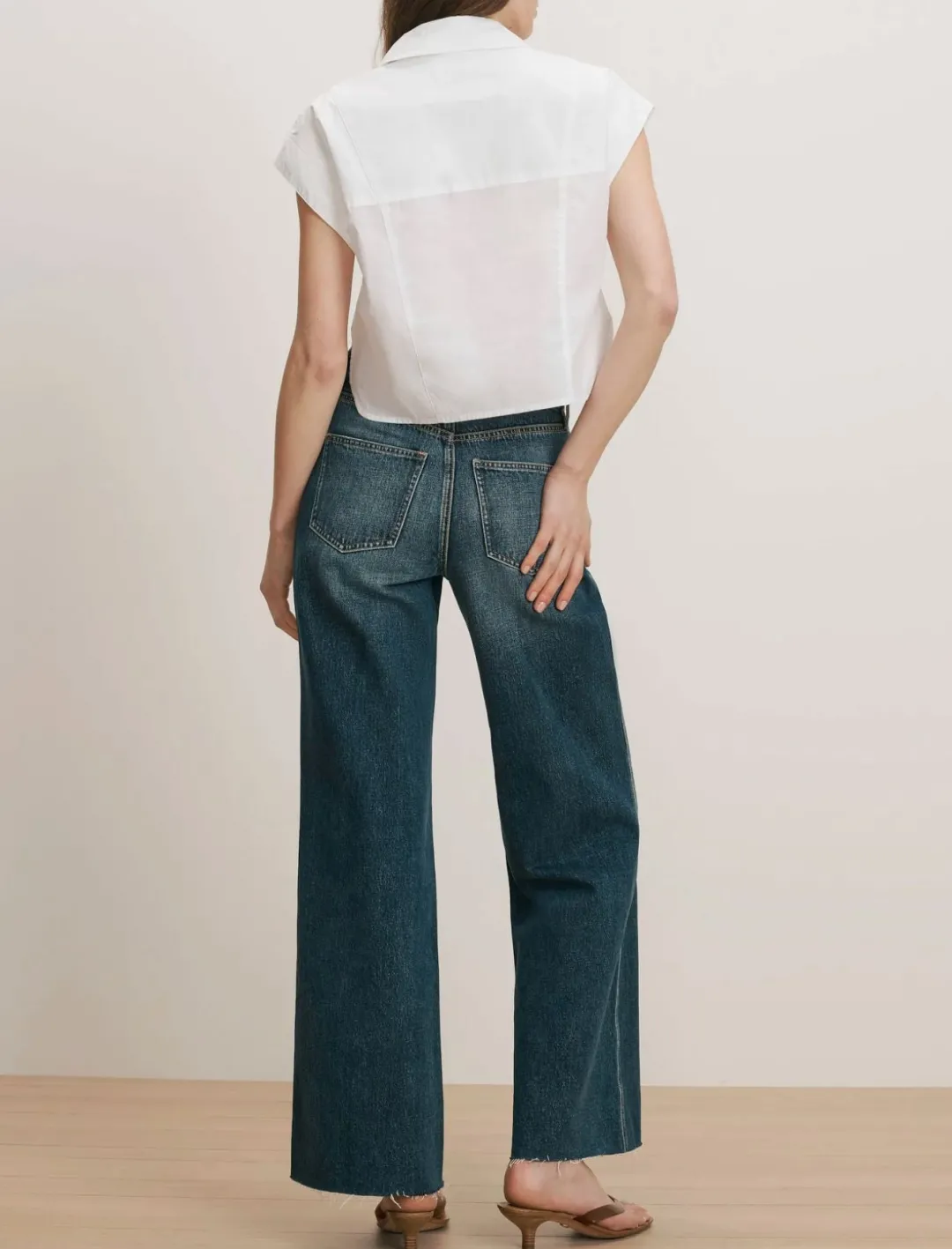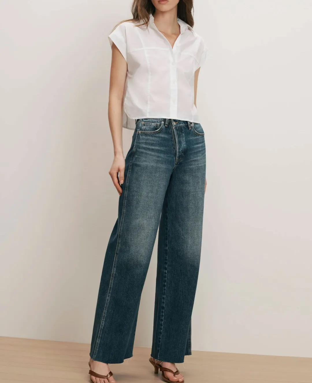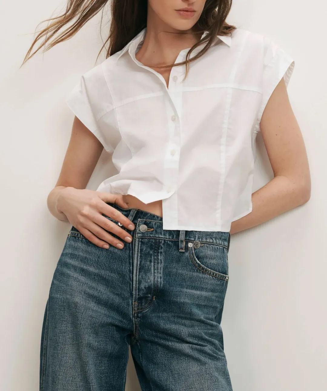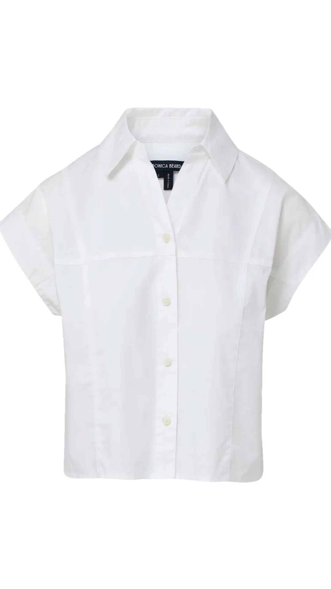 The essential button-down shirt—in spring-friendly proportions. Crafted from washed cotton poplin in white, the Nestor top features a cropped, short-sleeve silhouette, angled cap sleeves, and a trim collar. A lower back yoke allows the shirt to drape freely from the shoulders for a looser, more relaxed fit. Style with wide-leg jeans or twill trousers for chic ease.