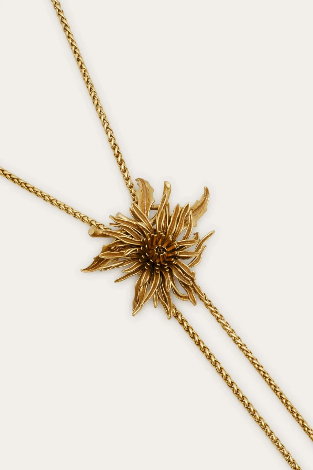 A brass bolo necklace adorned with a blooming flower accent.