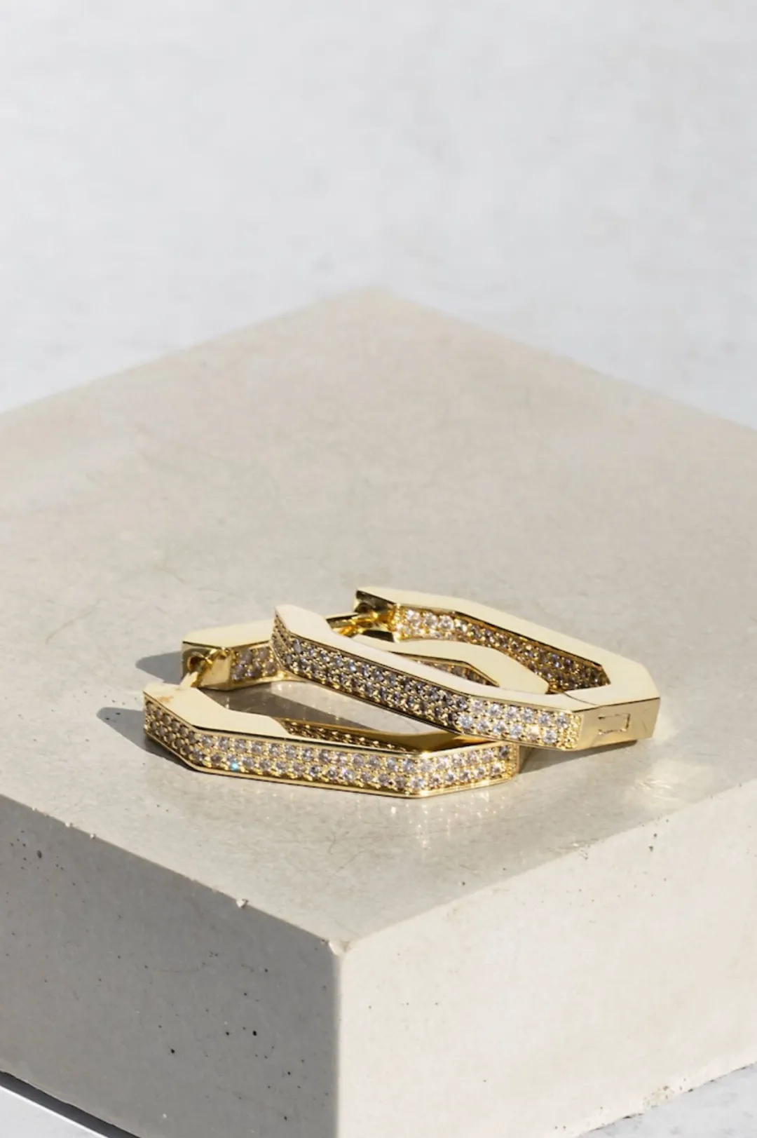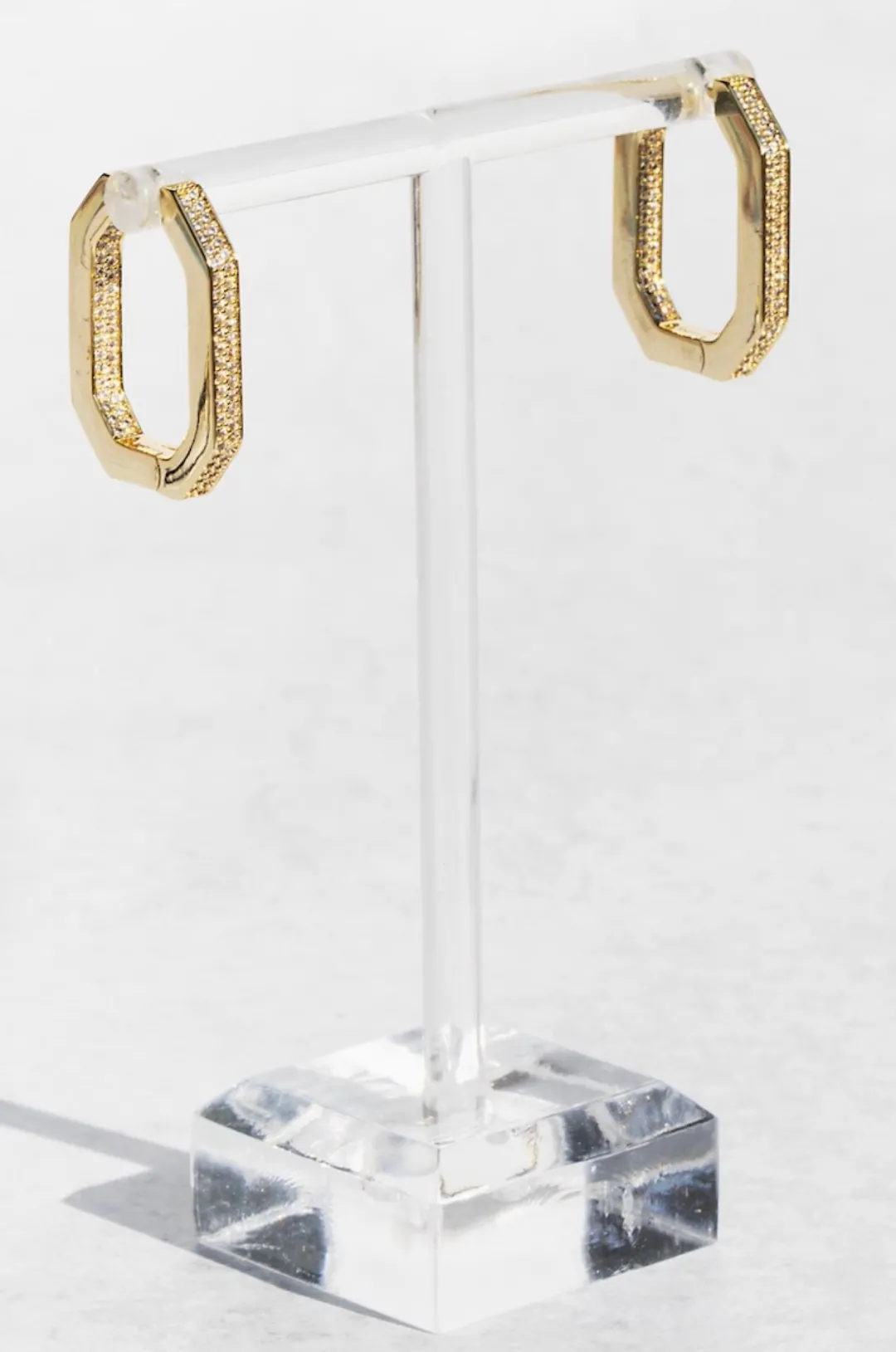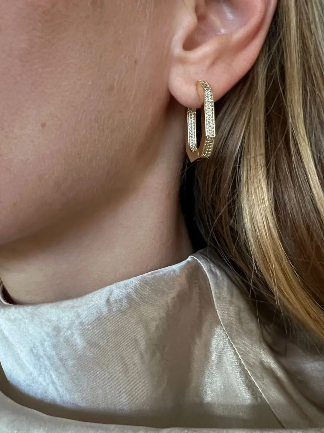 Sharp lines, strong angles—these octagonal hoops are made to stand out. Crafted in 14K gold plate and inlaid with clear CZs for a refined edge, they’re ultra-light and effortless for everyday wear. A bold, modern statement that catches the light and commands attention.