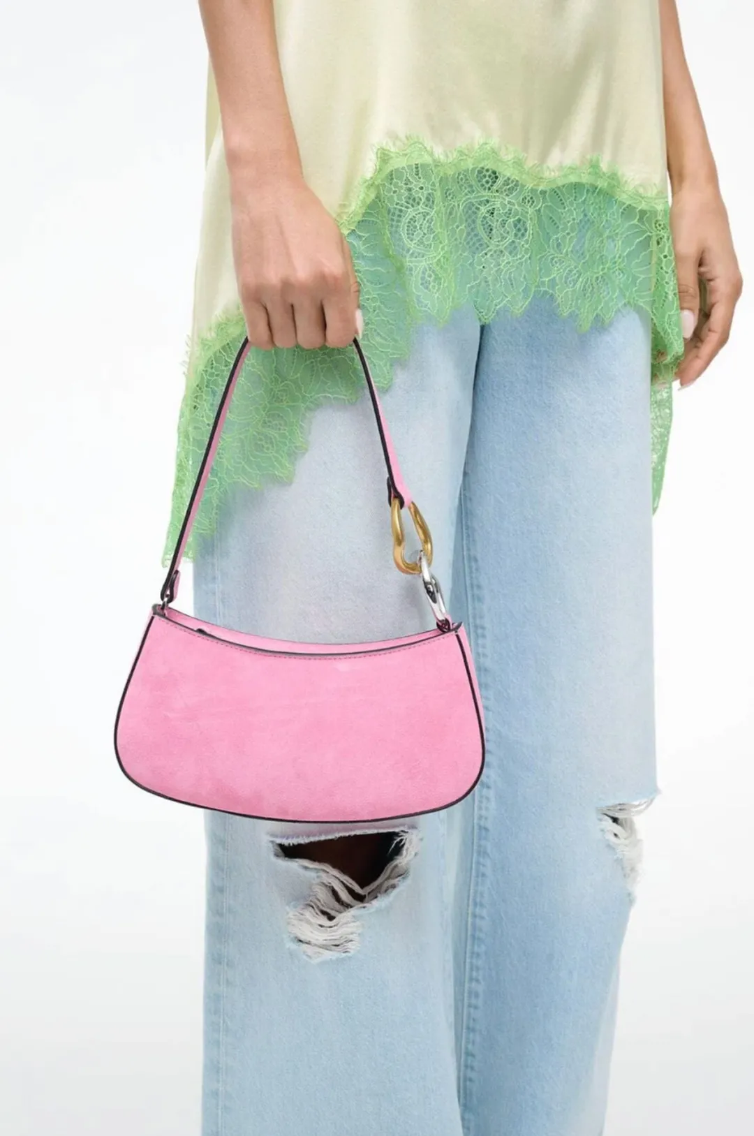 The Ollie Bag is a mini shoulder bag crafted from suede. This style features a two-tone hardware design on the strap and a zip closure.
