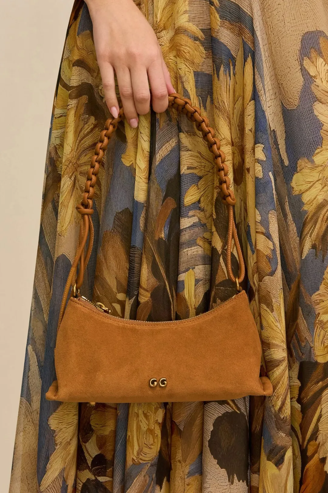 A suede leather shoulder bag with gold-toned hardware and an intricately woven strap.