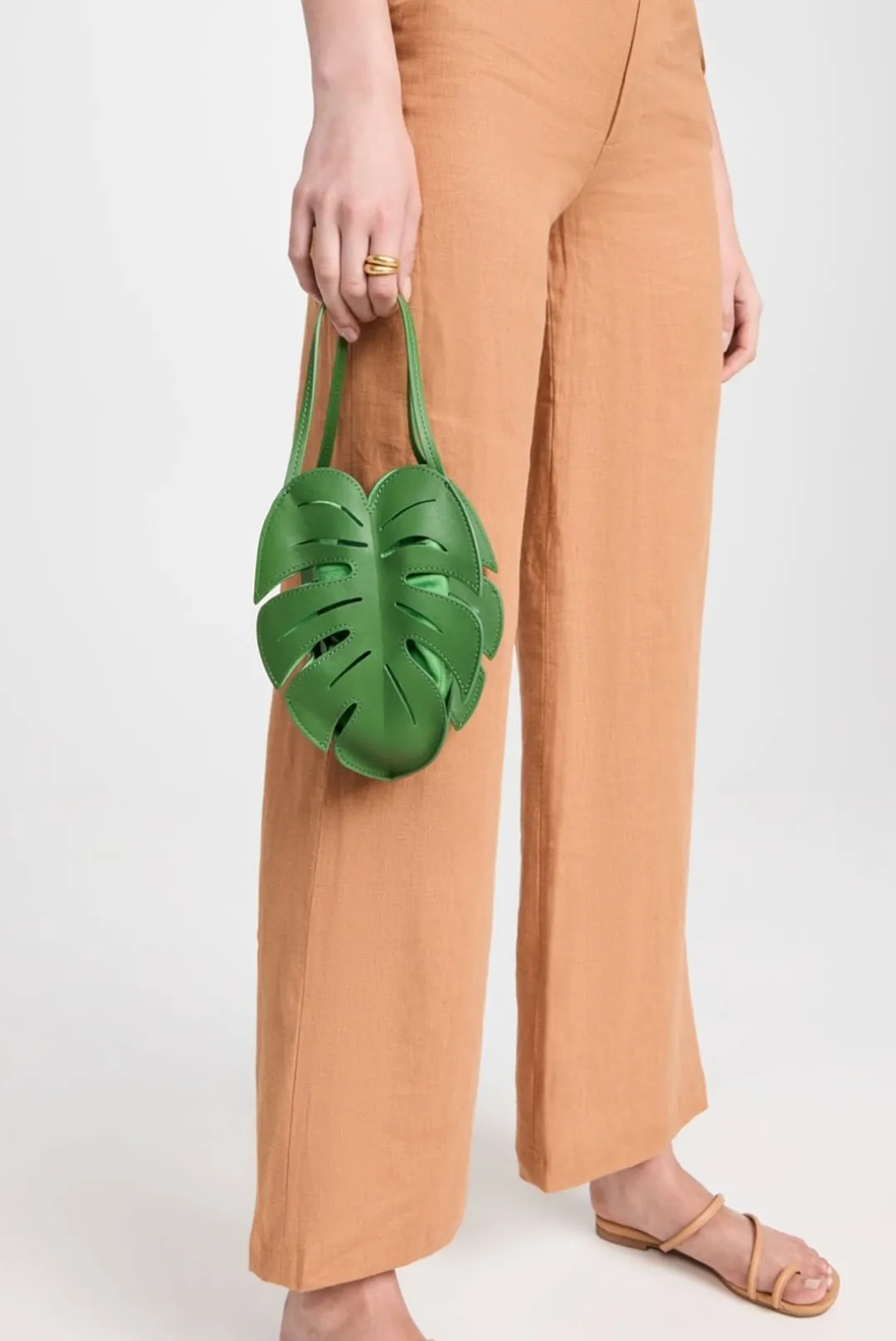 The aptly titled tote has a North/South silhouette made from bright green leather covered with three-dimensional palm leaves. It adds a playful touch to summer looks.
