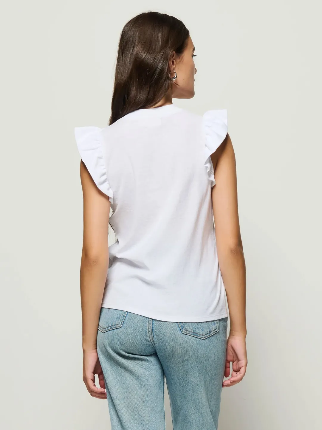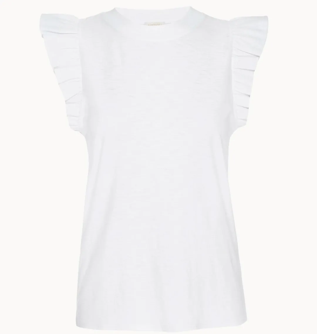 This is not your average white, ruffle tank: the ruffles are lightly fused, which adds a little extra kick (and makes your waist look smaller).