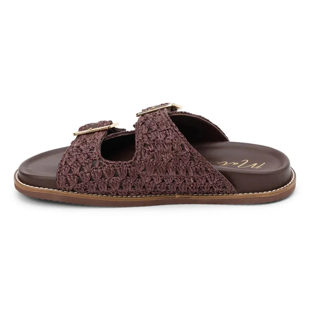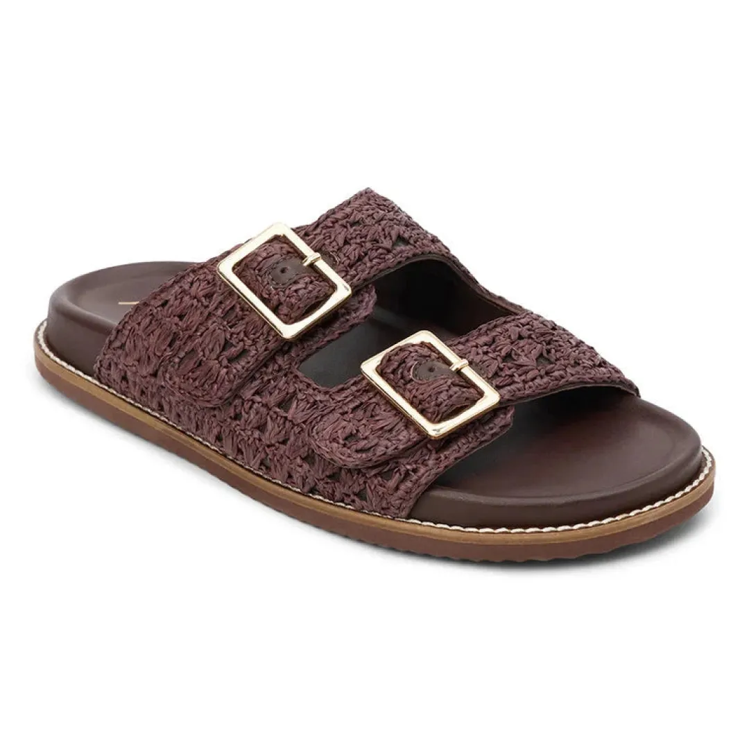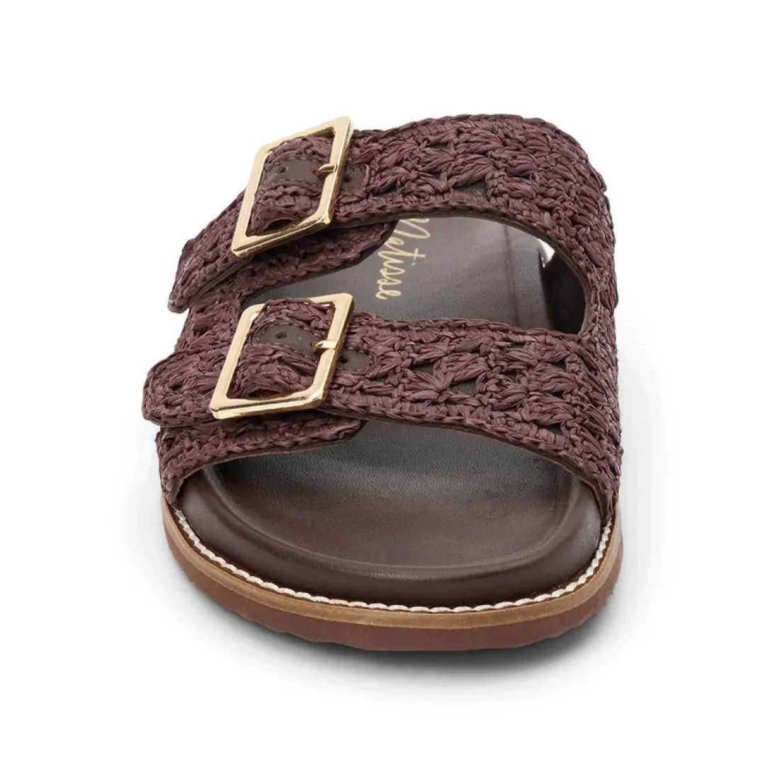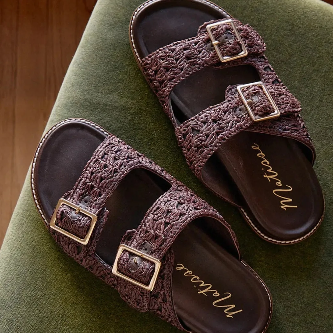 Brown woven raffia slide sandals with adjustable gold-tone buckles, a cushioned footbed, and a sturdy sole. A breezy, laid-back style perfect for warm-weather outings. Crochet, two-band footbed sandal.